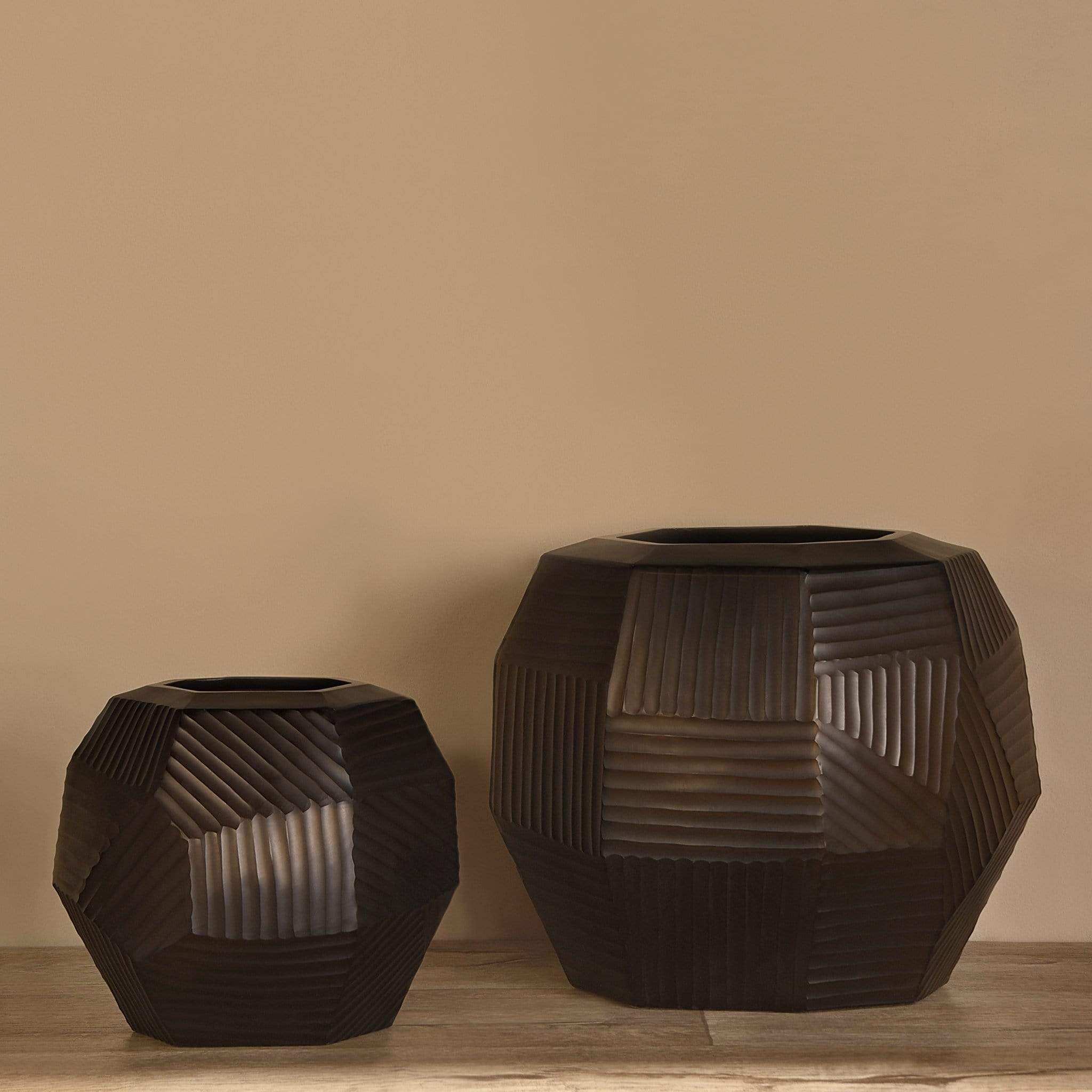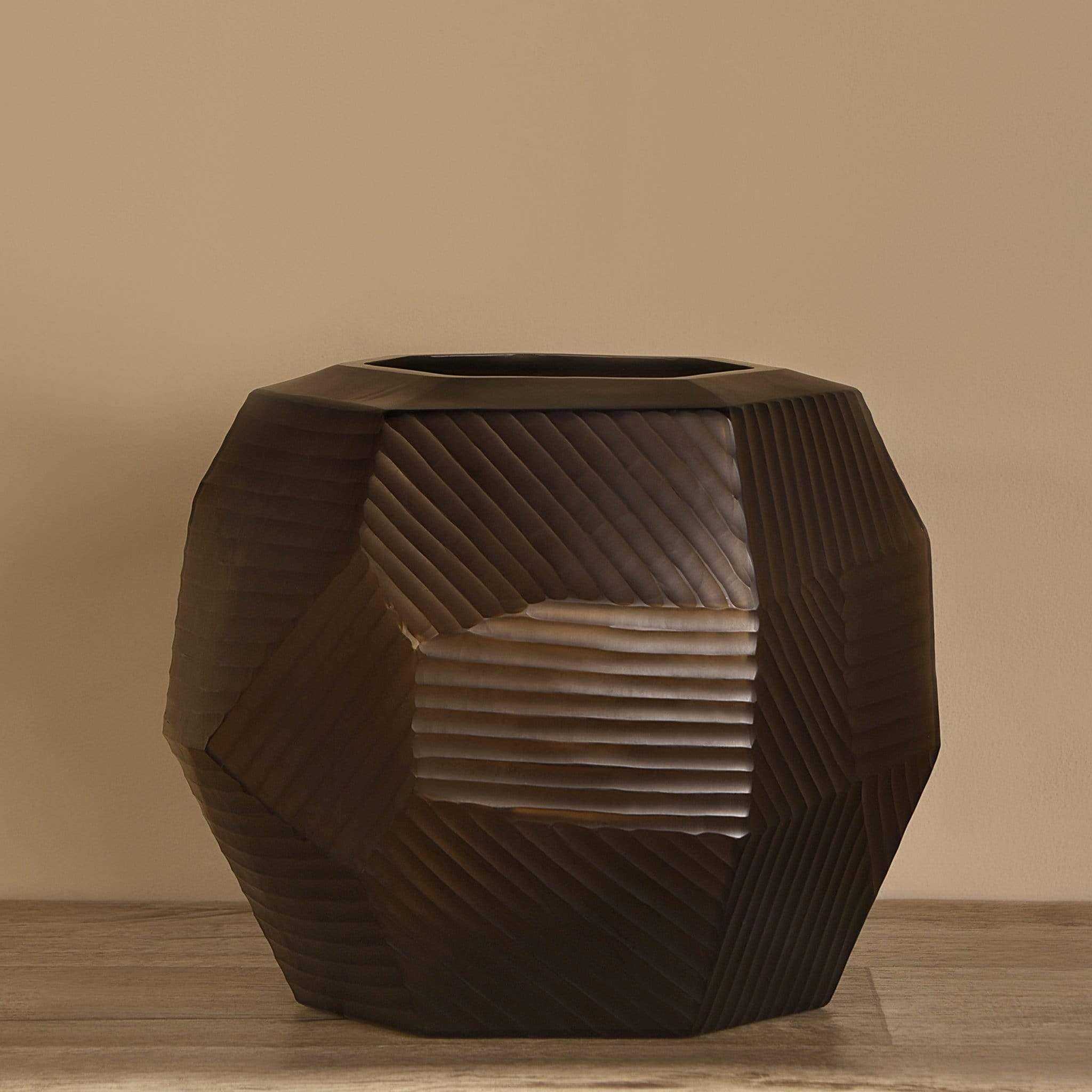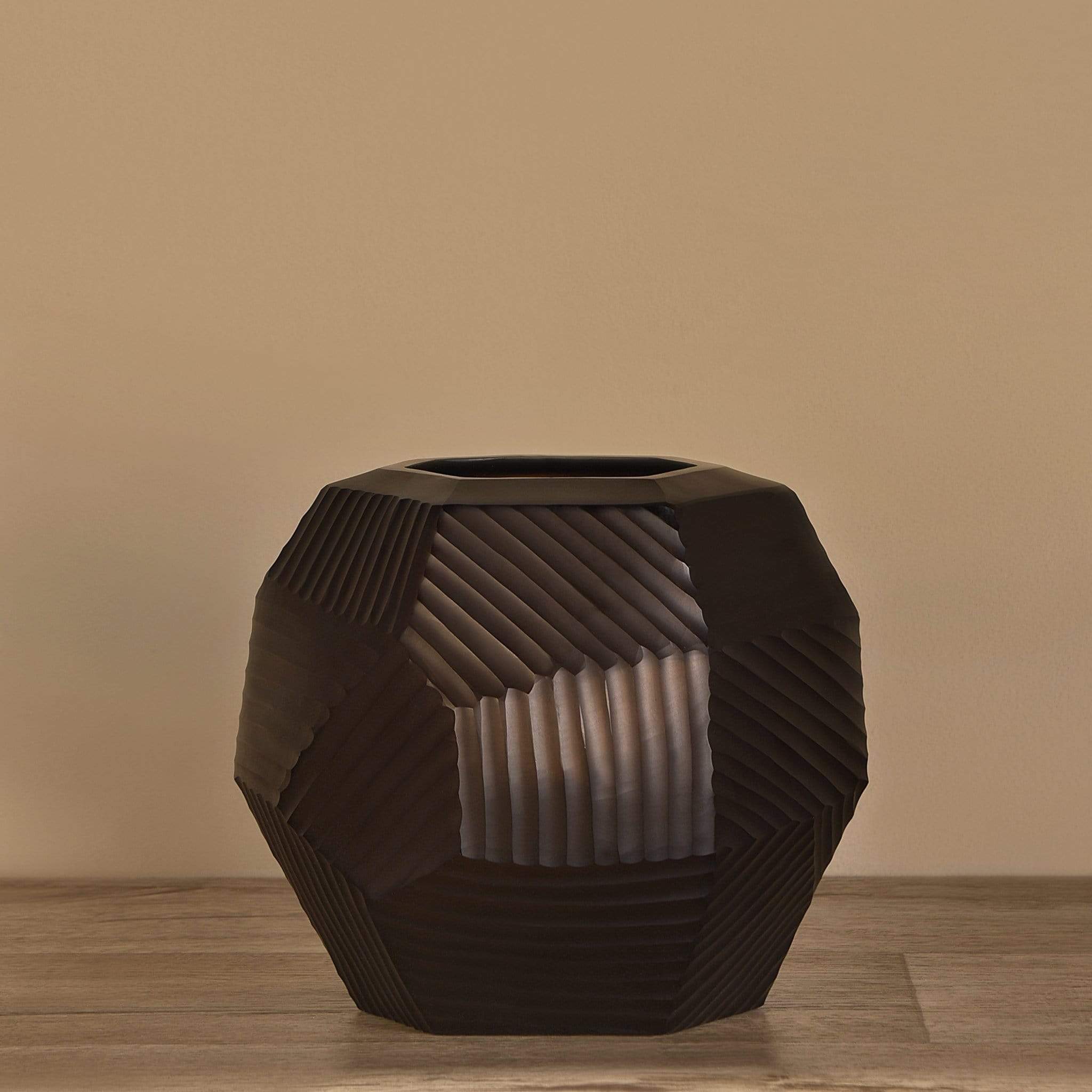 مزهرية أنيقة مستوحاة من شكل الطبل، صنعت من الزجاج المدخن بتصميم عصري يناسب ديكور المنزل والمناسبات الخاصة.