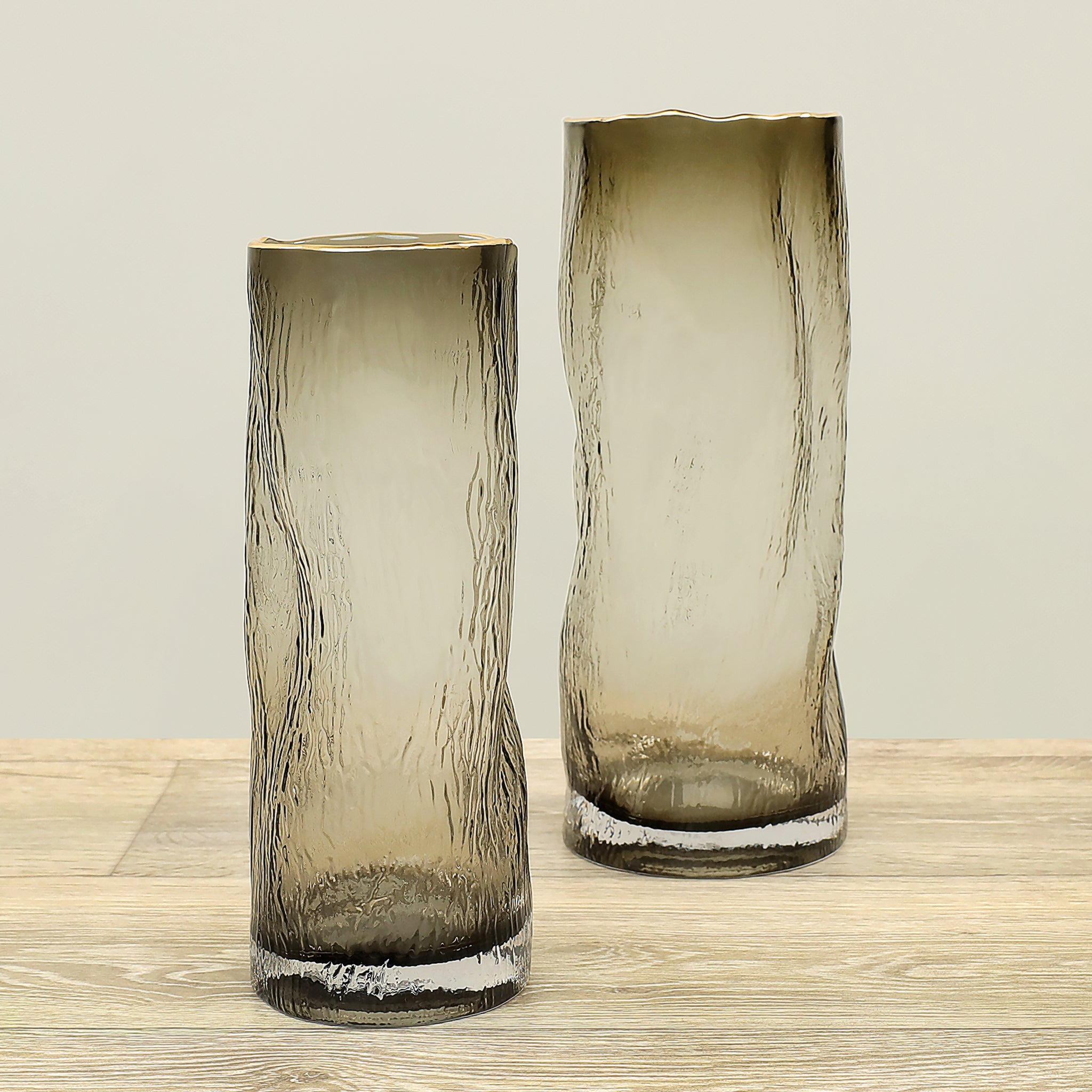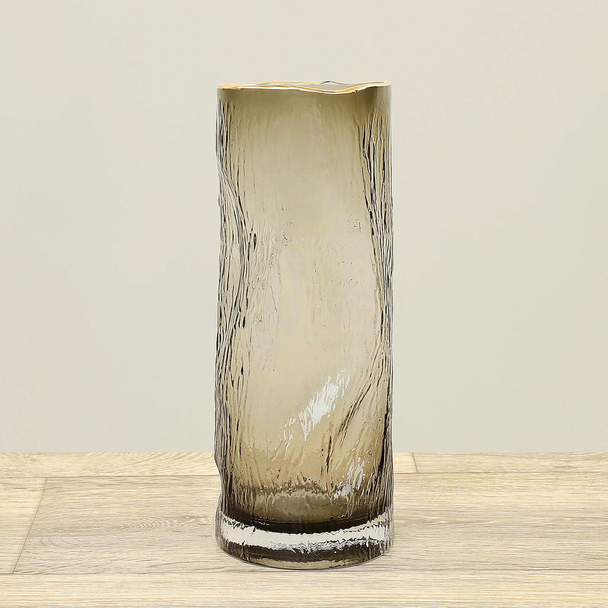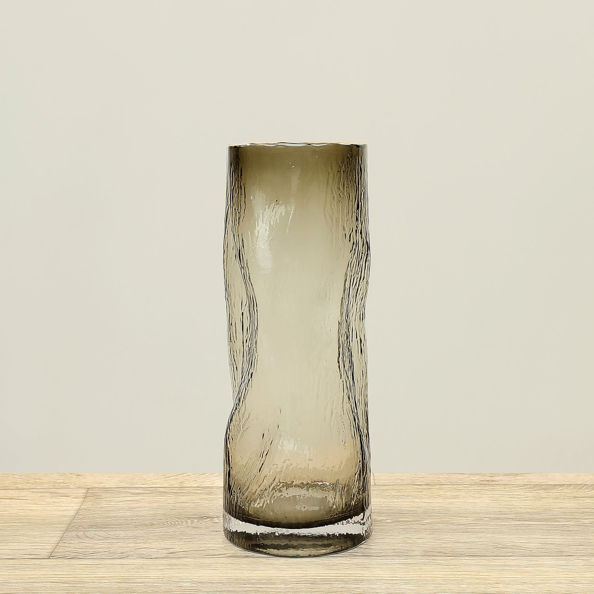 مزهرية زجاجية أنيقة بلون دخاني دافئ، تضيف لمسة عصرية وراقية إلى أي مساحة داخلية. التصميم الشفاف الجزئي يسمح بمرور الضوء بشكل جميل ويبرز ألوان الأزهار أو أغراض الديكور التي تضعها بداخلها.