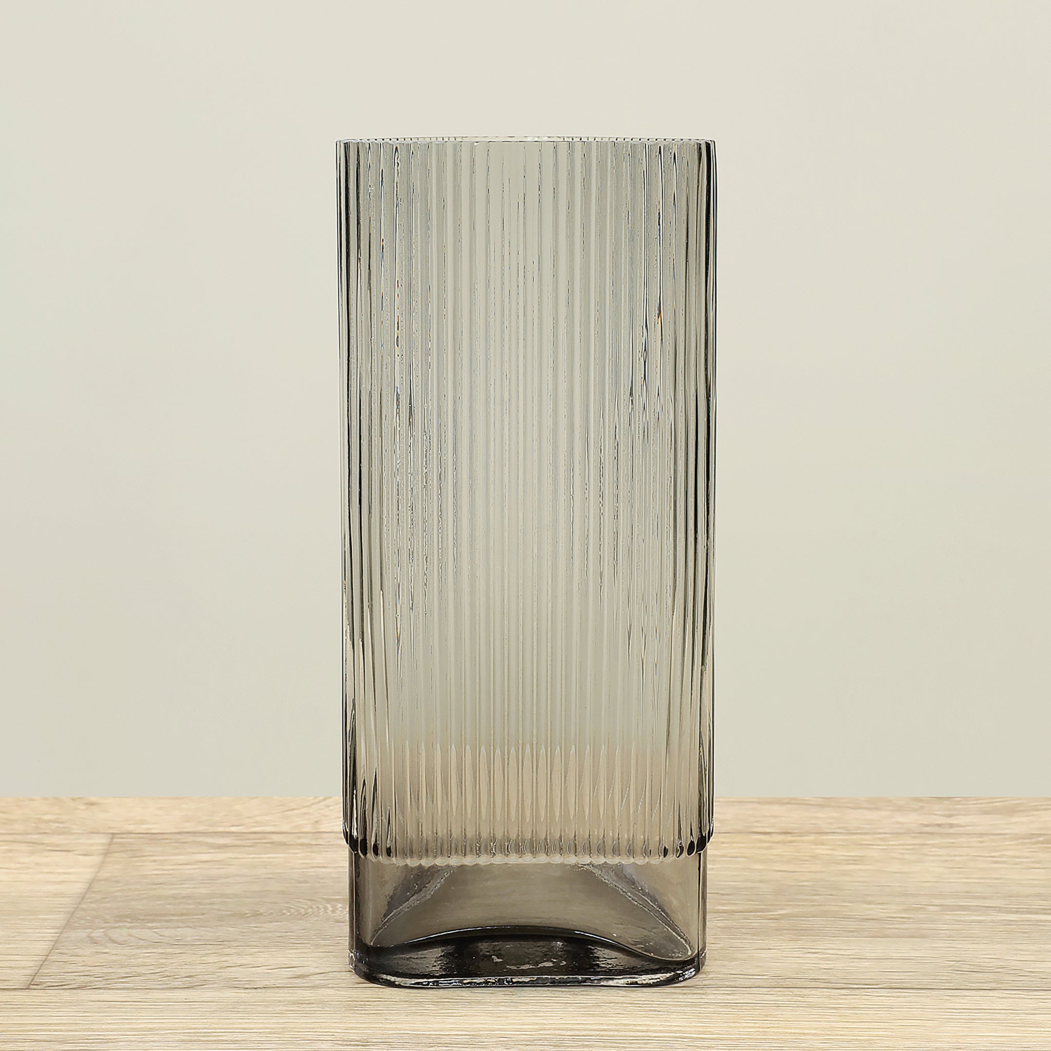 مزهرية زجاجية أنيقة ذات مظهر معاصر باللونين أزرق فولاذي ورمادي فاتح. تصميمها البسيط والتدرجات اللونية الهادئة تجعلها قطعة ديكور مميزة تضيف طابعاً رقيقاً وعصرياً لأي غرفة—مناسبة لتزيين طاولات الطعام، الرفوف، أو المداخل.