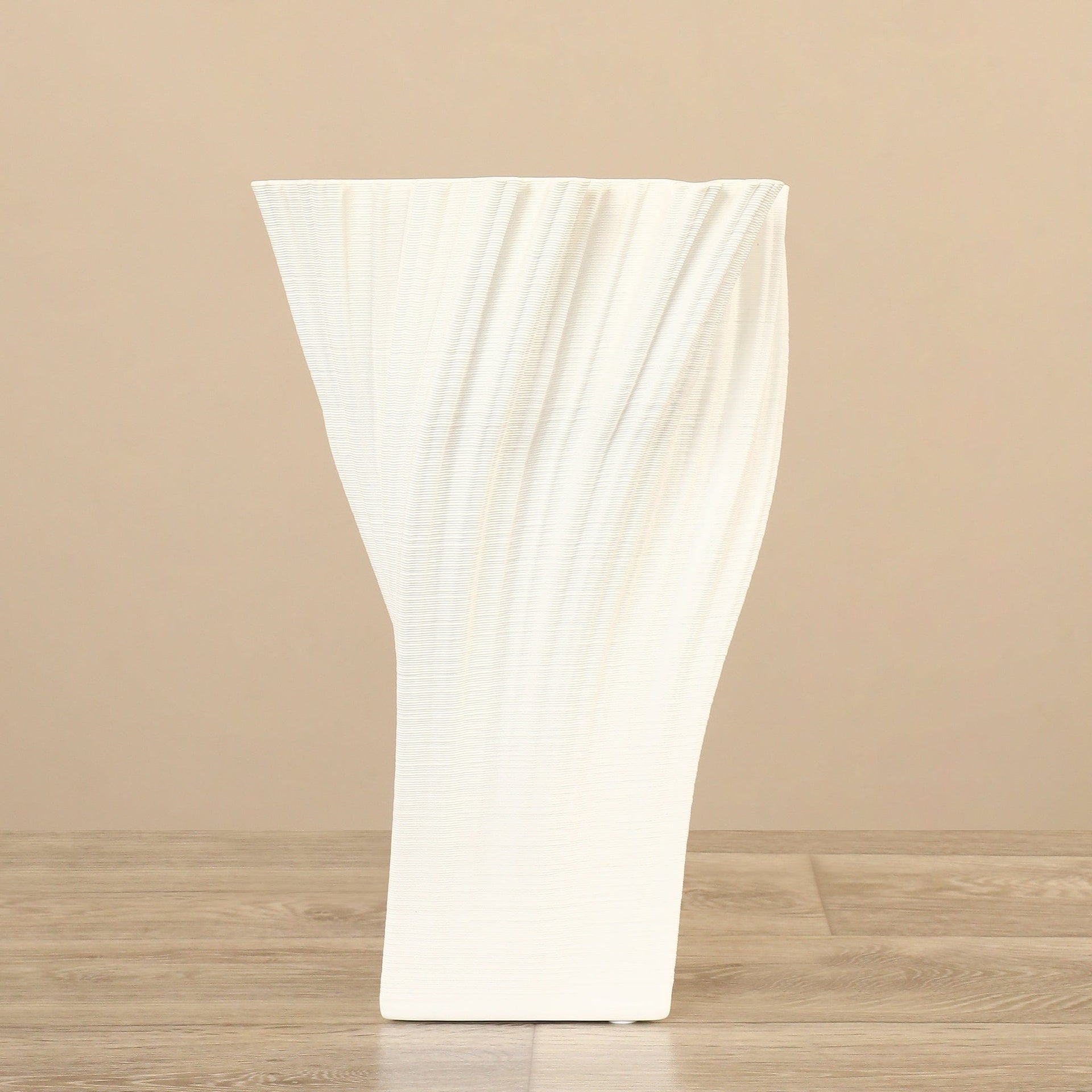 مزهرية تتميز ببساطة أنيقة ومظهر عصري راقٍ. مصنوعة من السيراميك مع تصميم مستطيل طويل ملتف يمنحها طابعًا نظيفًا وحديثًا، واللون الأبيض النقي يجعلها مناسبة لمختلف أنماط الديكور. حجمها ملائم للعرض على الرفوف والطاولات.