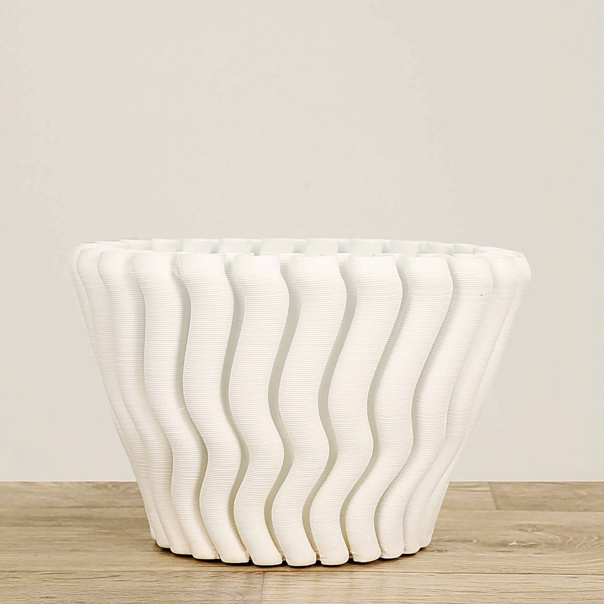 مزهرية أنيقة باللون الأبيض العاجي مع نقشة ثلاثية الأبعاد تعطيها مظهرًا مميزًا وملمسًا جذابًا. قطعة ديكور مناسبة للمساحات الداخلية وتمنح طابعًا هادئًا وأنيقًا لأي غرفة.