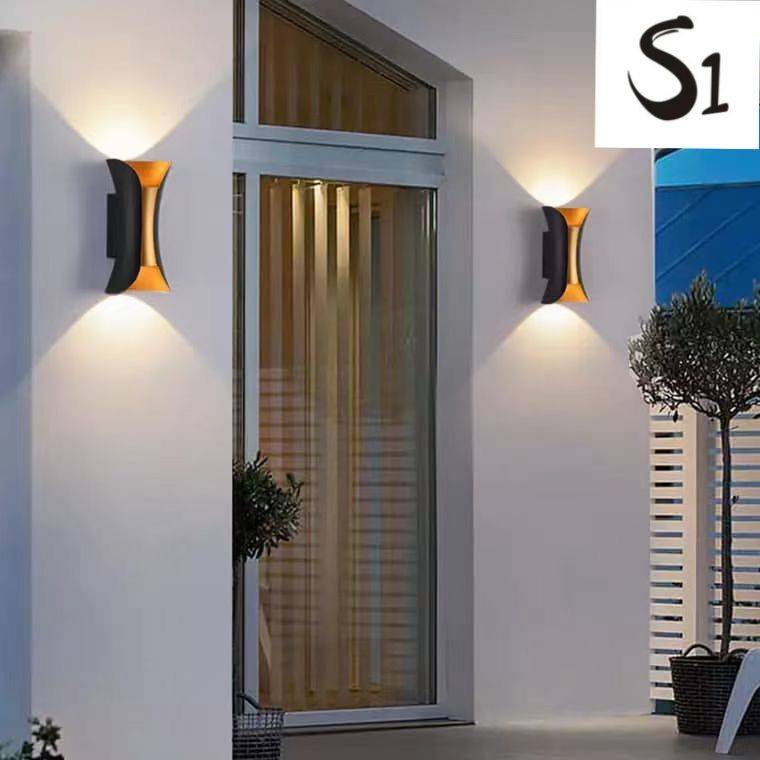 إنارة خارجية LED بتصميم أنيق يعمل على إضاءة جهتين، مع جسم خارجي باللون الأسود وداخل ذهبي يضيف لمسات جمالية لواجهات المنازل والحدائق.