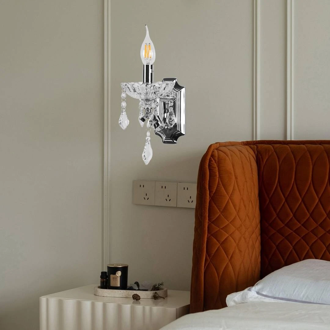 وحدة إضاءة جدارية بتصميم مودرن بلون فضي وزخارف شفافة، مناسبة لإضاءة زخرفية وعملية في الصالون، الممرات أو غرف النوم.