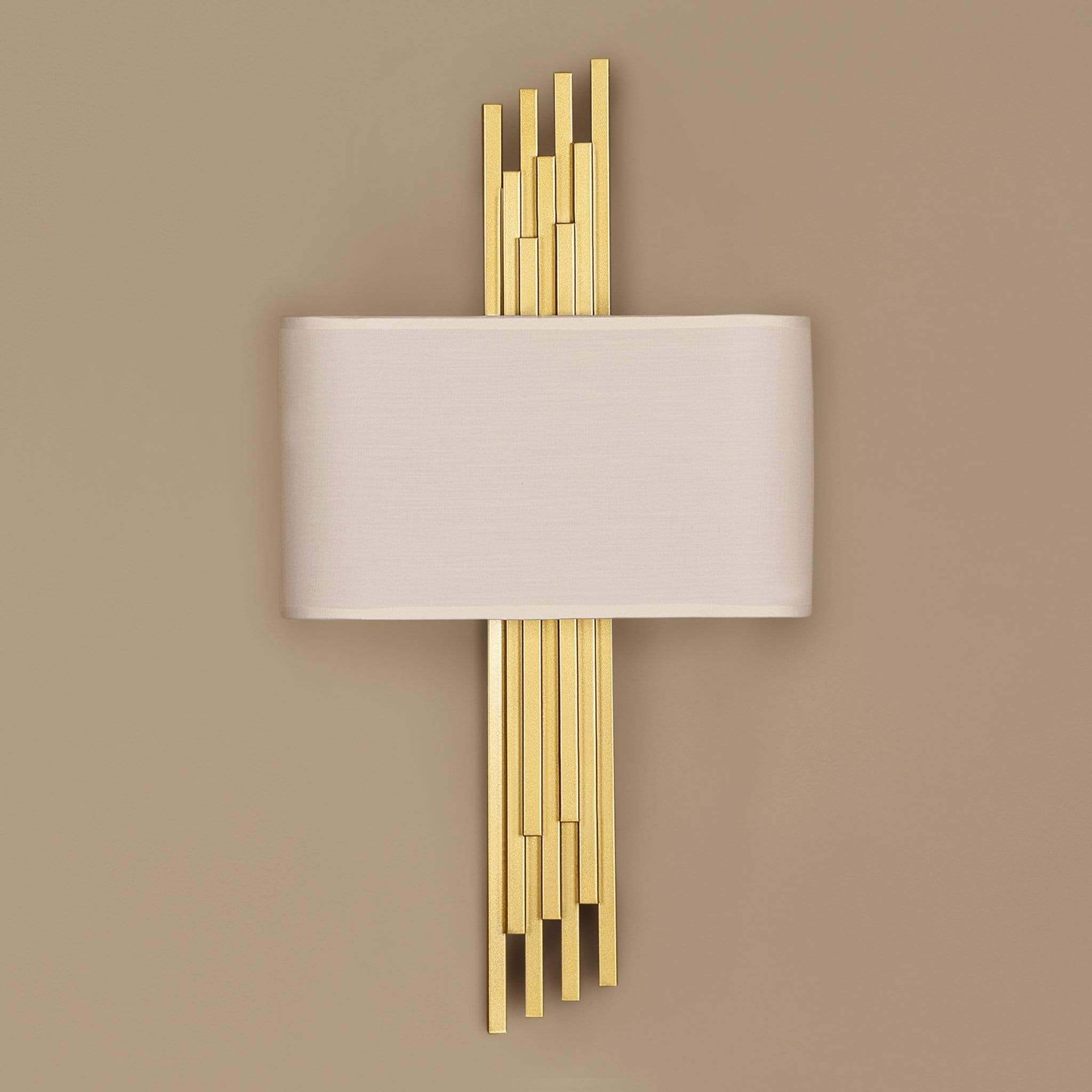 مصباح جداري بتصميم أنيق لمسة كلاسيكية بنهاية نحاس أصفر أثري، يجمع بين متانة المعدن ونعومة المظلة القماشية لإضاءة ديكورية وعملية.