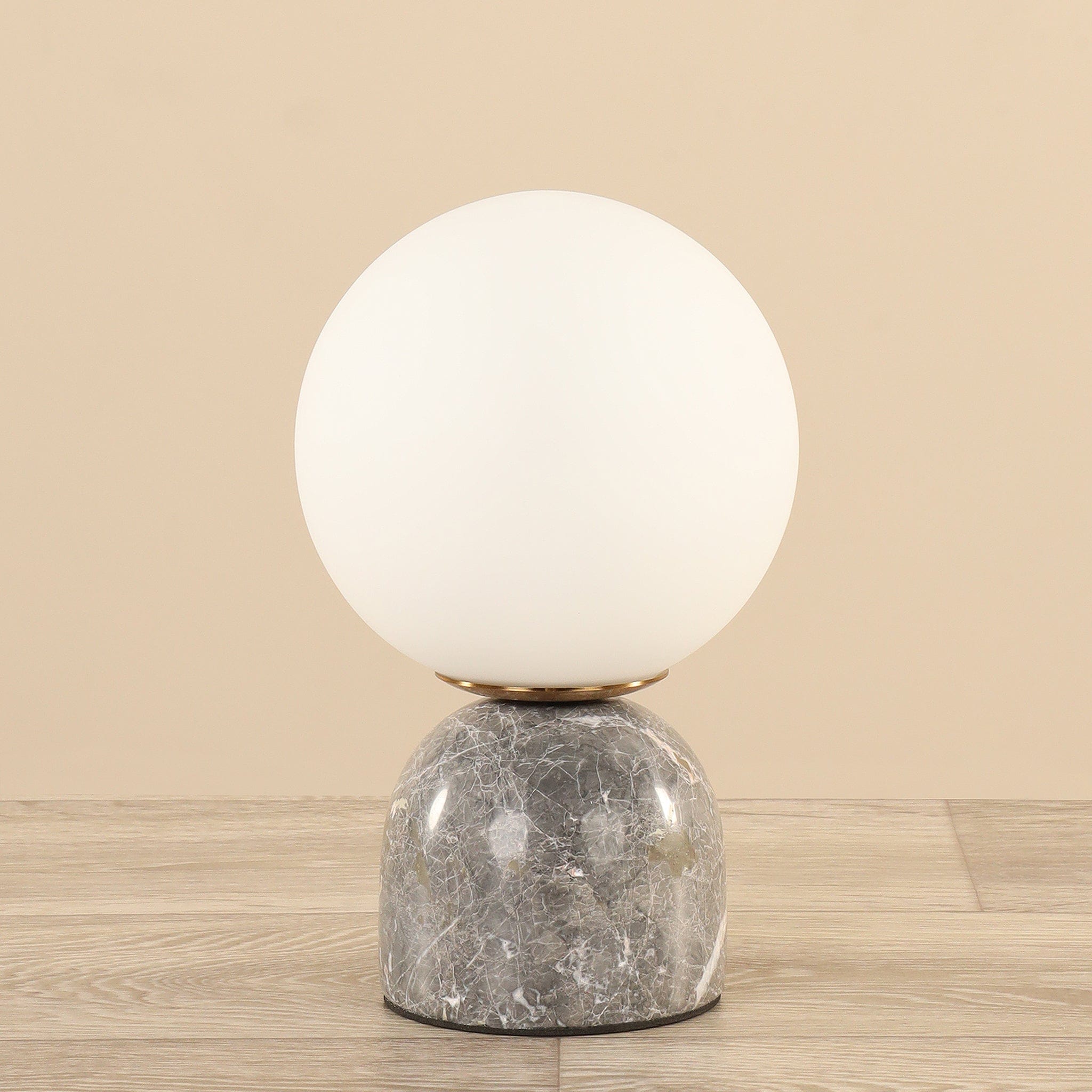 أباجورة أنيقة تجمع بين شفافية الزجاج وفخامة الرخام الطبيعي، تصميمها مثالي لإضاءة هادئة ولمسة ديكور راقية في غرفة المعيشة أو غرفة النوم.