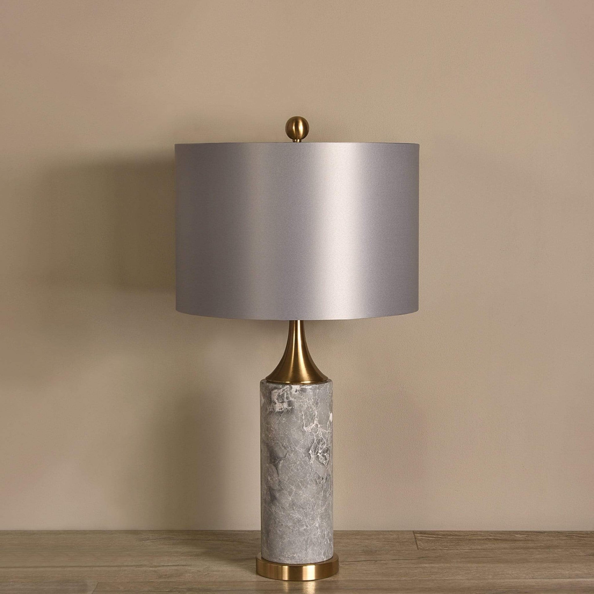 أباجورة أنيقة تجمع بين فخامة الرخام ولمسات برونزية عصرية؛ قاعدة متينة من الرخام الرمادي الطبيعي مع ظل بلون رمادي لامع وتصميم يناسب طاولات السرير، المكاتب ومنضدات العرض.