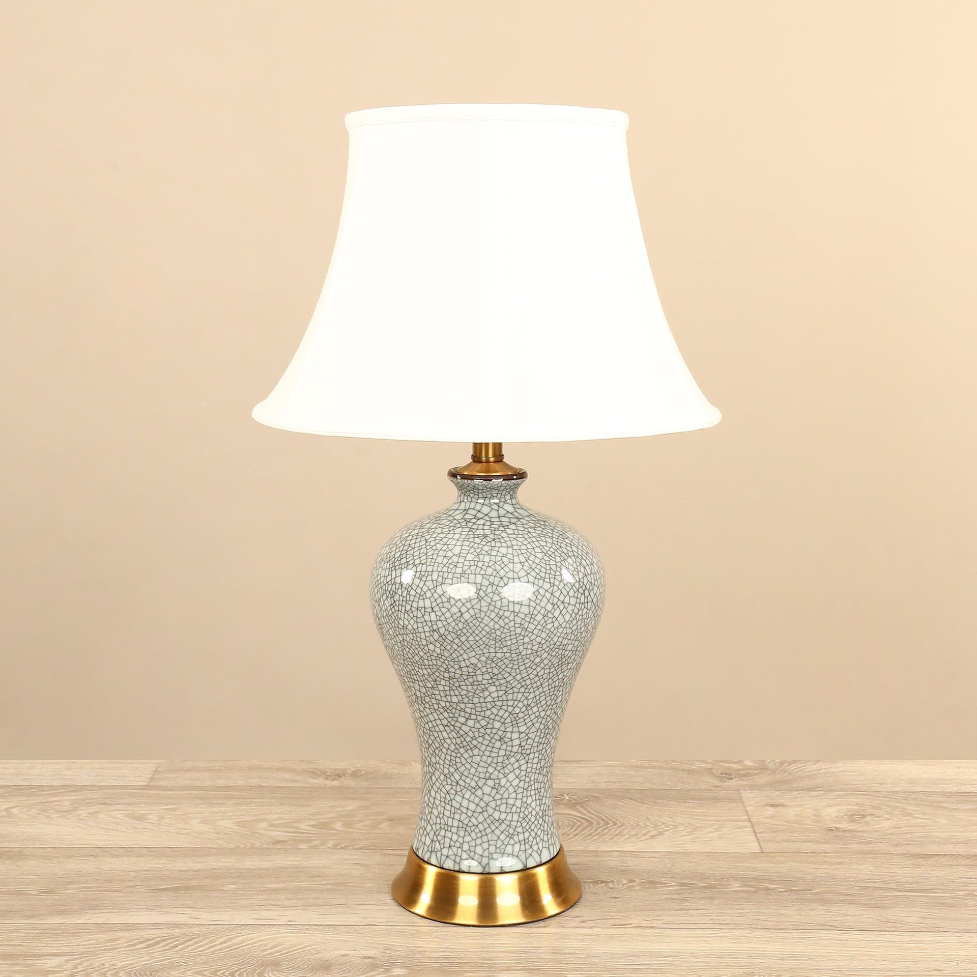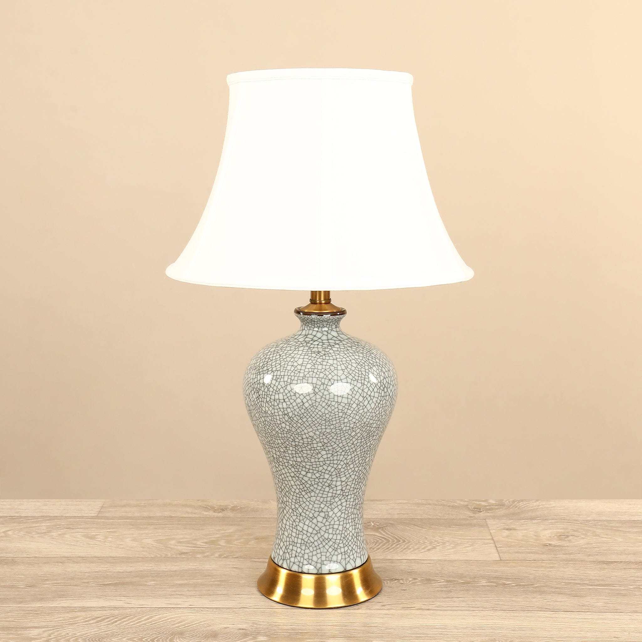 مصباح أنيق مستوحى من شكل جرة الزنجبيل يجمع بين الجمال والعملية ليمنح مساحتك إضاءة عصرية ولمسة ديكور مميزة. قاعدة سيراميكية منحنية باللون الرمادي مع حواف ذهبية لامعة وظل قماشي متناسق، تصميم يناسب غرفة المعيشة، غرفة النوم أو المكتب.
