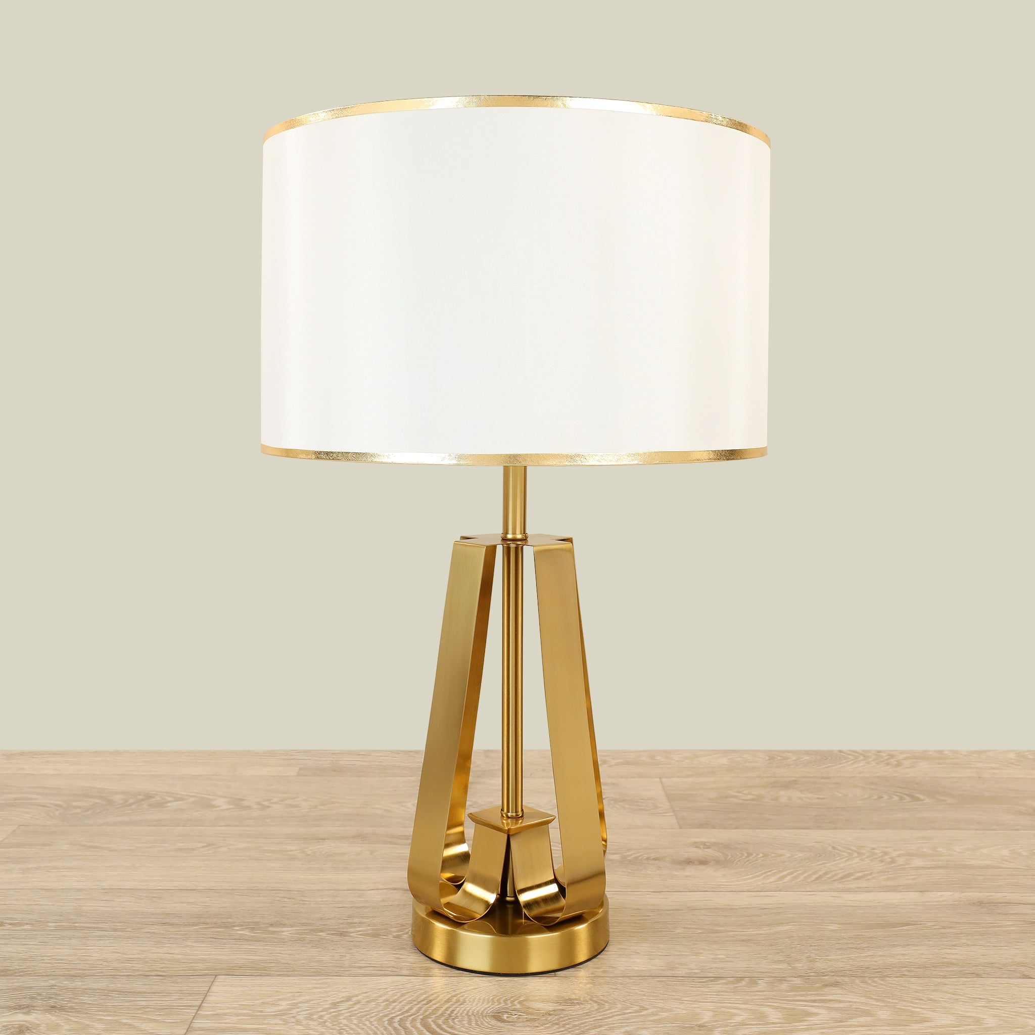 مصباح طاولة أنيق بتصميم ذهبي يجمع بين المتانة والمظهر الناعم بفضل هيكله المعدني وظله القماشي. مثالي للإضاءة الجانبية في غرفة المعيشة، المكتب أو غرفة النوم.
