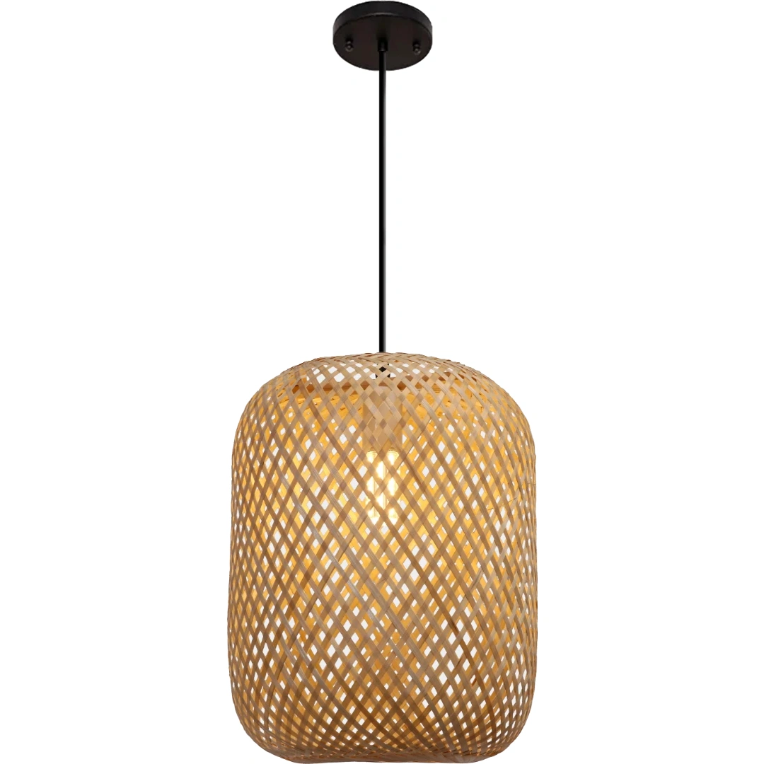 إضاءة عصرية بطابع ريفي مستوحاة من الأشجار المتدلية — ظلال خيزران أنيقة تمنح المكان دفئًا وطابعًا طبيعيًا مع توزيع ضوئي ناعم ومريح.