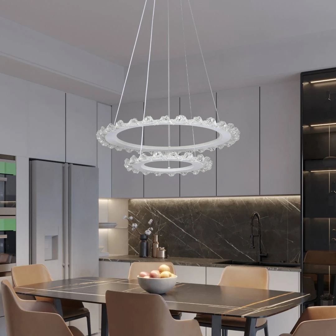 إضاءة مودرن أنيقة مناسبة للصالات الواسعة. نظام LED ثلاثي الألوان يمنحك خيارات إضاءة دافئة، محايدة وباردة لتغيير جو المكان بسهولة وتصميم يبهر العين وينعش المكان.
