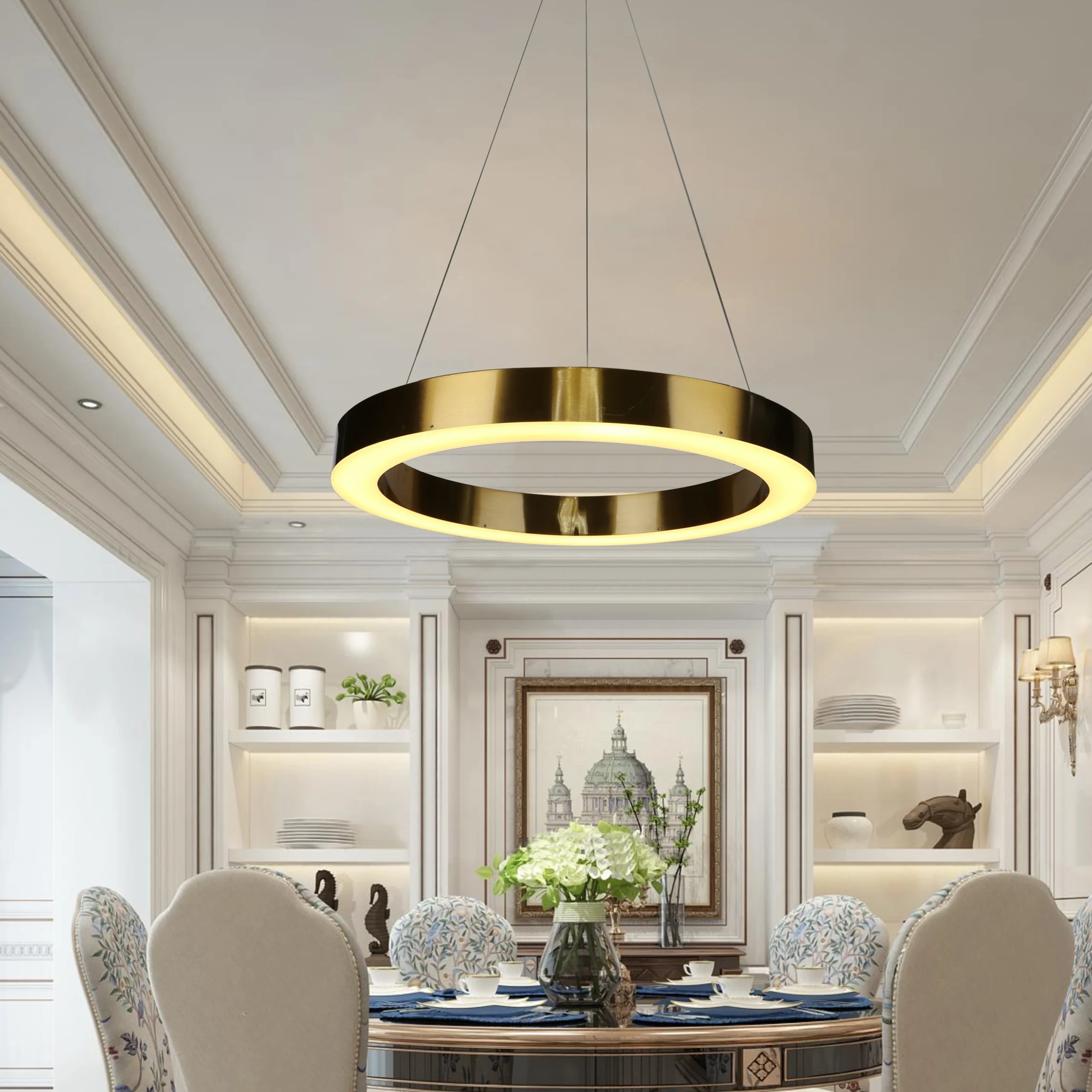 ثريا ذات طابع مودرن أنيق تضيف لمسة جمالية وعصرية لأي غرفة. تصميمها العملي يوفّر إضاءة دافئة بلون أصفر مع إمكانية تغيير وضعية الألوان بسهولة عبر مفتاح الحائط.