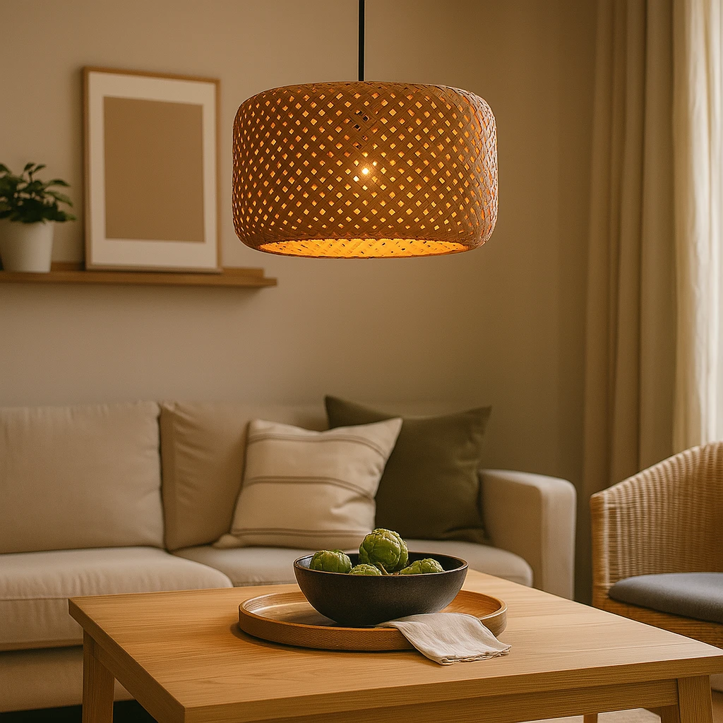 مصباح معلق بغطاء خيزران بتصميم يدوي عصري يضفي طابعًا ريفيًا وطبيعيًا على المكان. يناسب لمبات بقاعدة E27 (لمبة واحدة) ويمنح إضاءة محيطية ناعمة تتفاوت حسب نوع اللمبة المستخدمة (LED موصى به لتوفير الطاقة). قطر الظل 300 مم مما يجعله مناسبًا فوق طاولات صغيرة، ممرات أو كنقطة محورية في غرفة المعيشة.