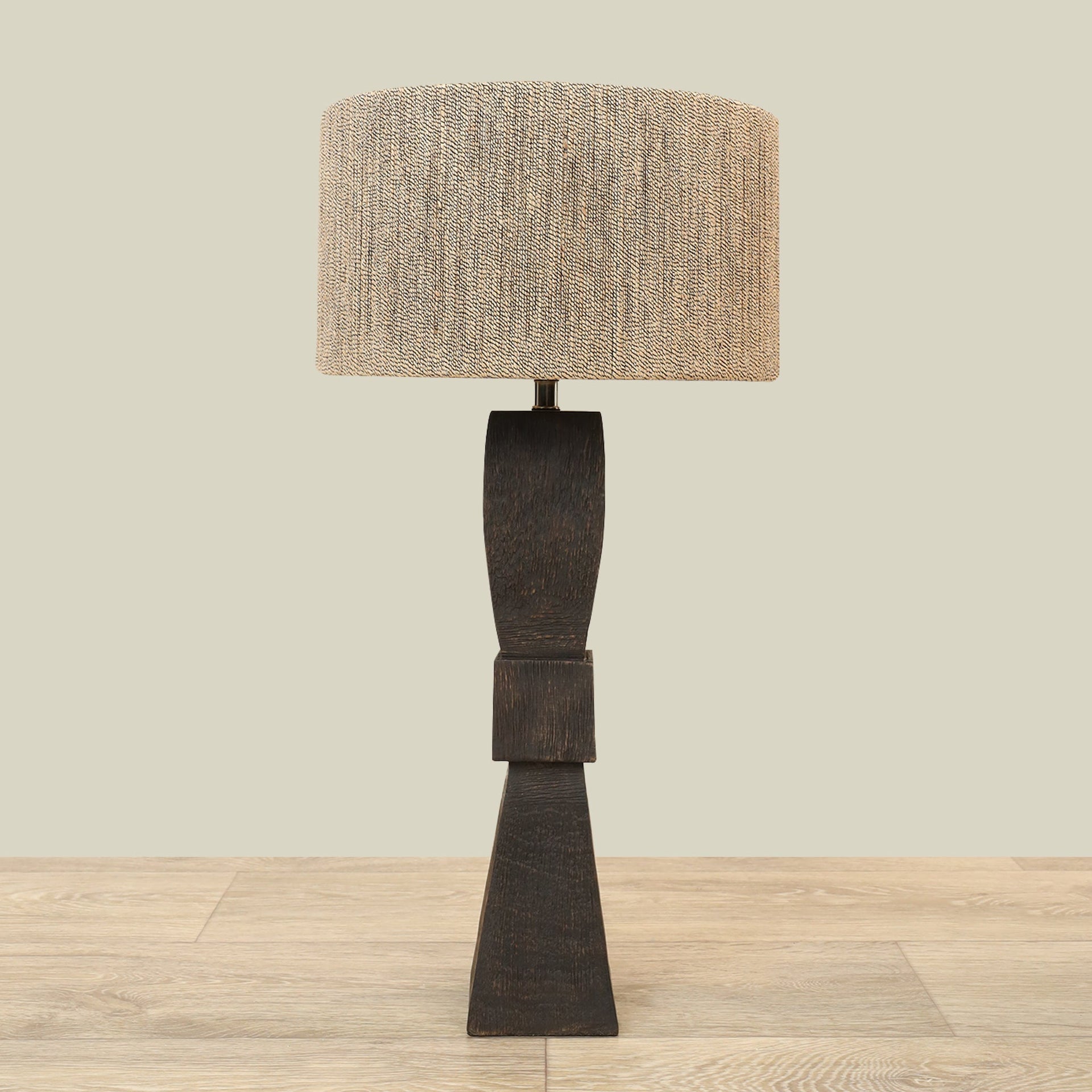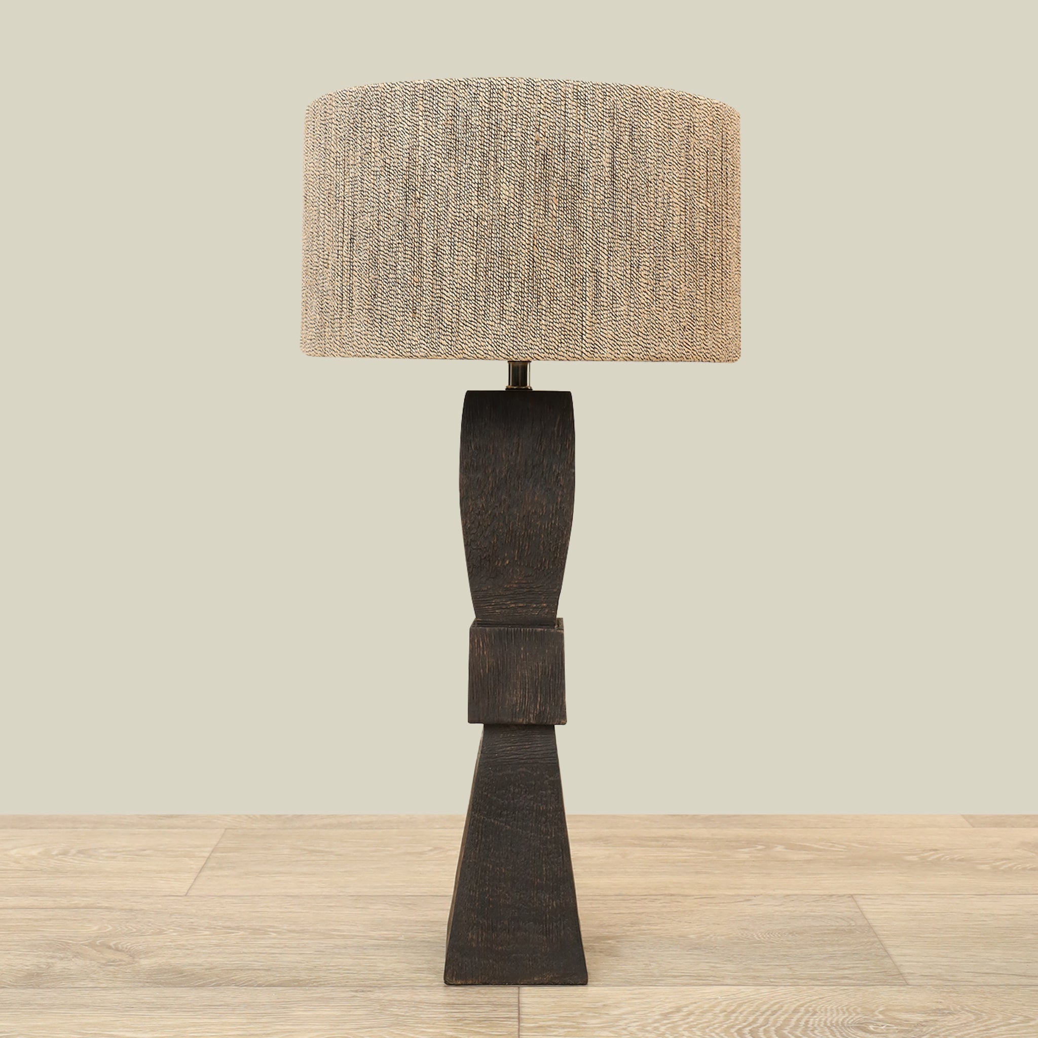 مصباح طاولة أنيق بلمسة نهائية من حبل أسود طبيعي وقاعدة خشبية محروقة تمنحه جمالية ترابية ودافئة. هيكله الخشبي يضمن متانة وثباتًا مع الحفاظ على طابع طبيعي يعزز أجواء المكان.