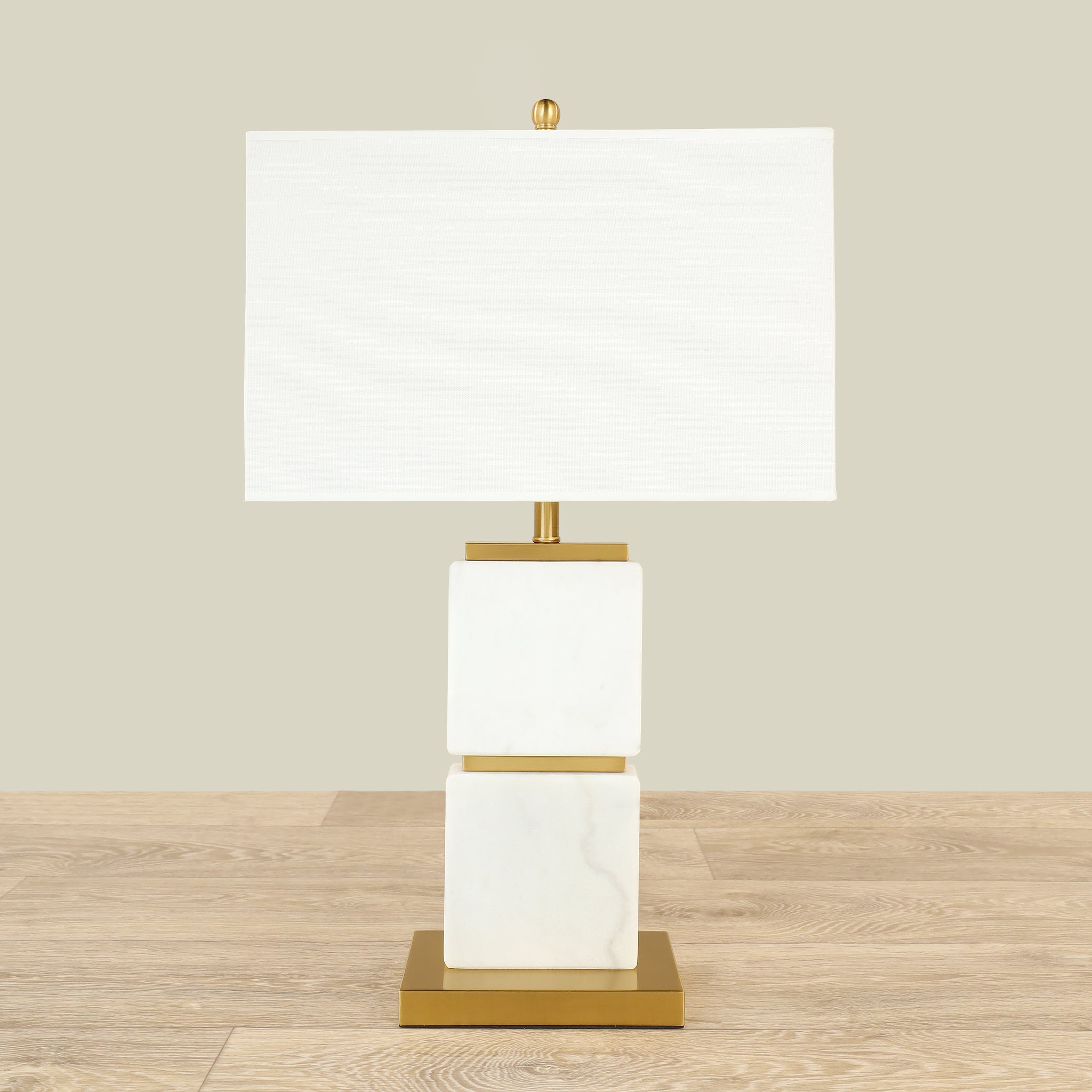 مصباح طاولة أنيق يجمع بين الفخامة والعملية، بتصميم يجمع اللونين الذهبي والأبيض. تركيب الجهاز يدمج المعدن والقماش مع قاعدة من الرخام لثبات ومظهر راقٍ، ويأتي مع المصابيح مضمّنة وجاهز للاستخدام.