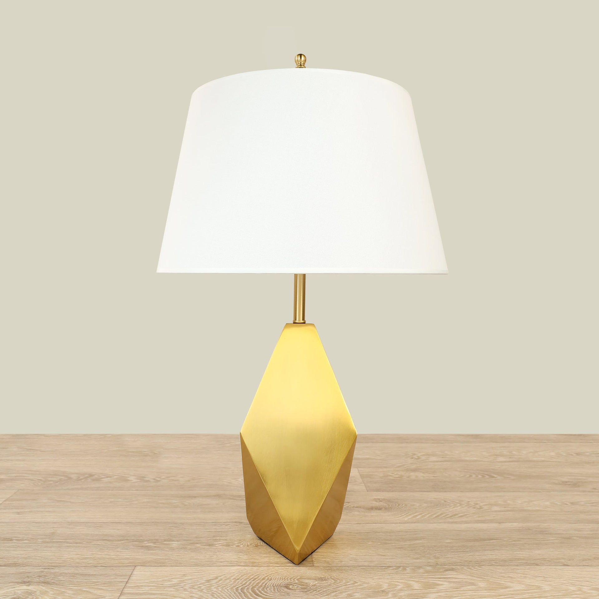 مصباح طاولة بلون ذهبي مع مزيج من المعدن والقماش لتصميم أنيق وعصري، مناسب للإضاءة الجانبية في غرفة المعيشة أو غرفة النوم.