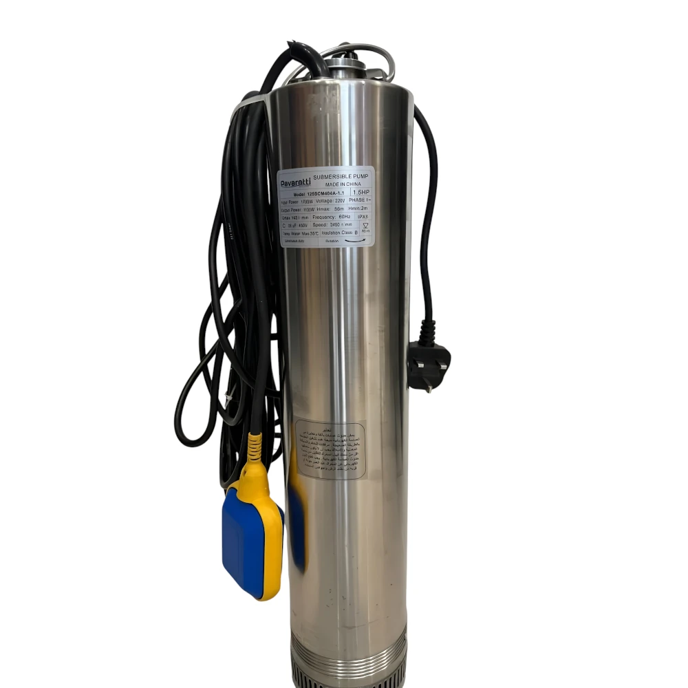 مضخة غاطسة مياه بافاروتي 1.5 حصان — مخرج 1.25 بوصة، رفع 56 متر، مع عوامة وسلك 12 متر