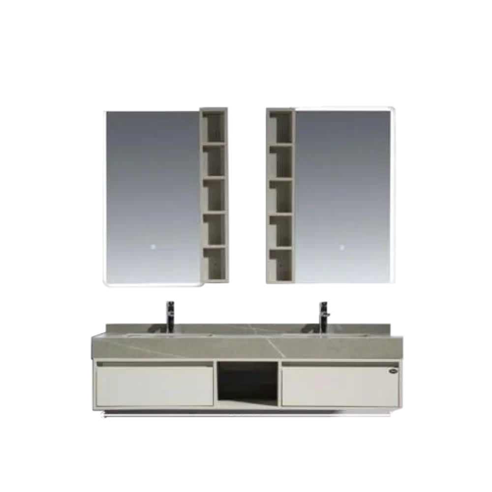 جدد حمامك بأناقة مع مغسلة VERAGO الفاخرة المصممة لتجمع بين المظهر العصري والعملية اليومية. الوحدة بعرض 150 سم تحتوي حوضين سيراميك، سطح من الرخام الصناعي، وخزائن من خشب البلايوود المعالج، مع مرايا بإضاءة LED تضفي لمسة من الفخامة والراحة.