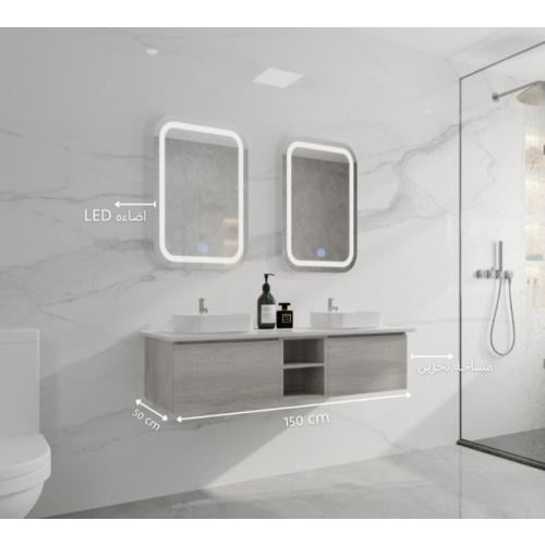 جدد حمامك بقطع تجمع بين المتانة والأناقة مع مغسلة فيراجو العصرية. تصميم عملي وفاخر مصنوع من خشب البلايوود المعالج المقاوم للماء والرطوبة، مع سطح من الرخام الصناعي وحوضين سيراميك ومرايا LED لإضاءة متكاملة ومظهر راقٍ.