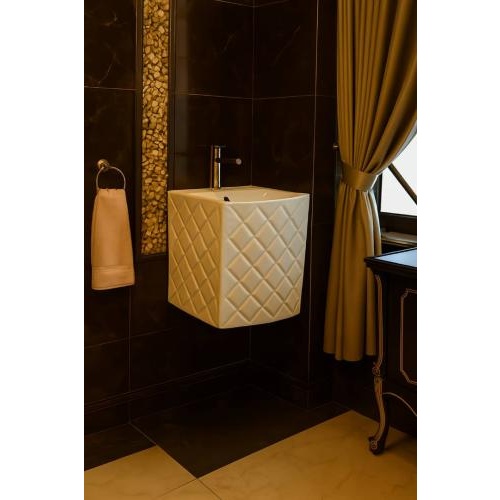 مغسلة سيراميك مربعة معلقة – تصميم عصري باللون الأبيض
