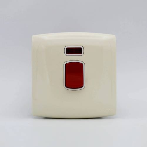 مفتاح مكيف بقدرة 45 أمبير باللون البيج، مصمم لتحمّل الأحمال الثقيلة مثل المكيفات. يأتي بإطار خارجي من البولي كربون المقوى لزيادة المتانة ومقاومة الصدمات، مع تصميم أنيق يلائم التركيبات المنزلية والتجارية.