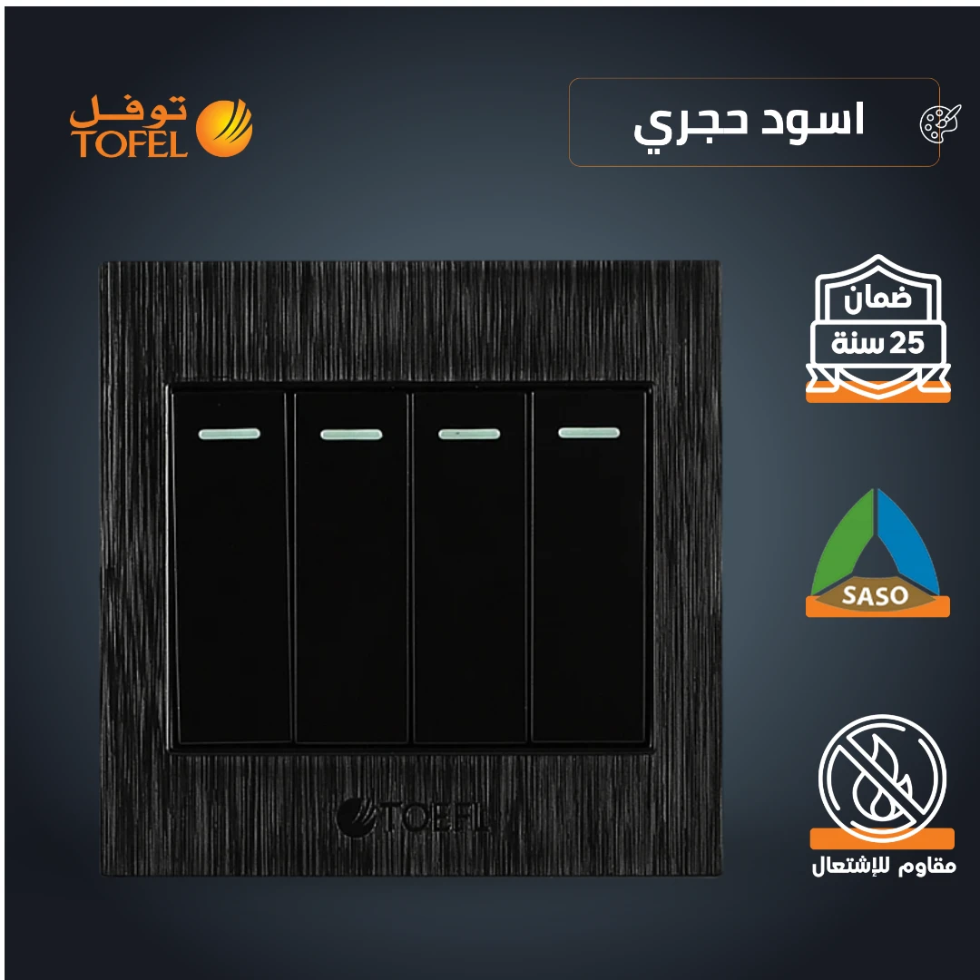 مفتاح إضاءة رباعي بتصميم كلاسيكي مصمّم للتحكم في توصيل التيار الكهربائي إلى مجموعة كاملة أو إلى مجموعات محددة من المصابيح، مناسب للاستخدام المنزلي والمكتبي مع تشطيب بلون أسود حجري (توفل).