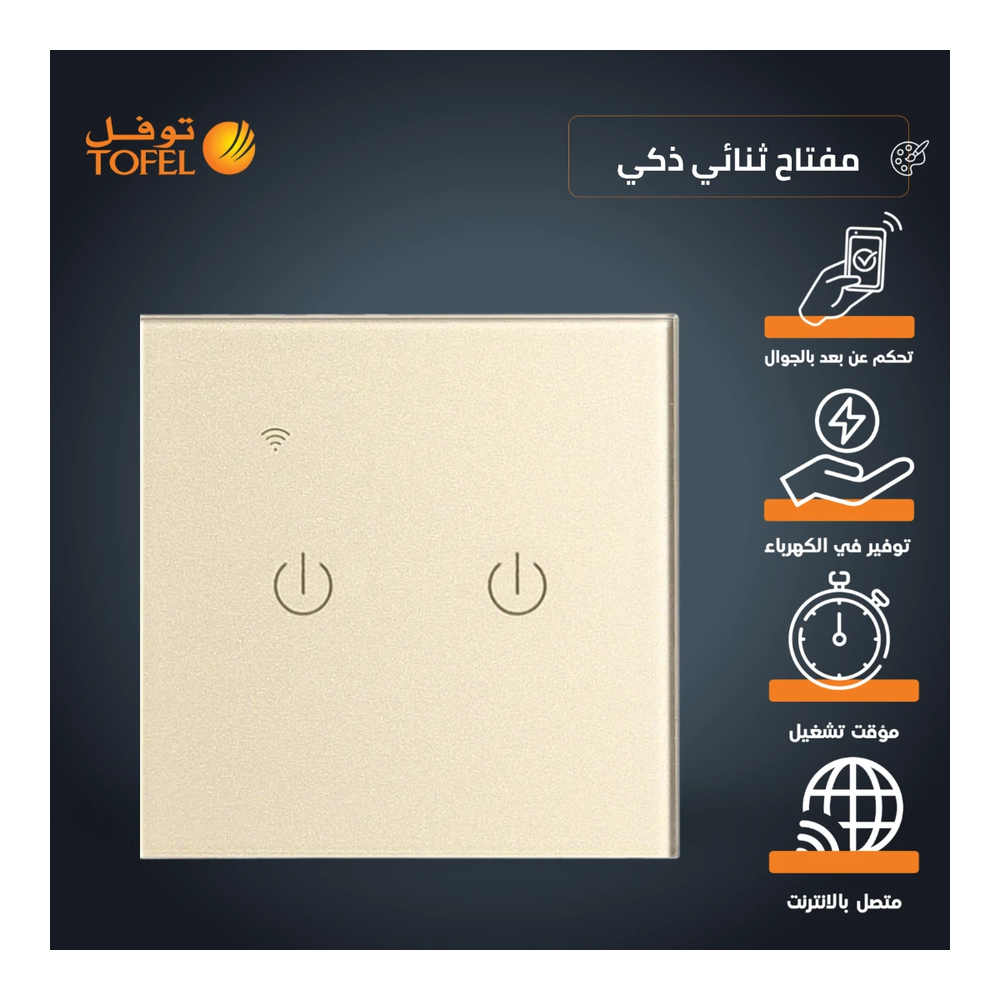 مفتاح ذكي ثنائي — غطاء ذهبي | تحكم عن بعد WiFi | شاشة لمس | متوافق مع أليكسا وجوجل هوم