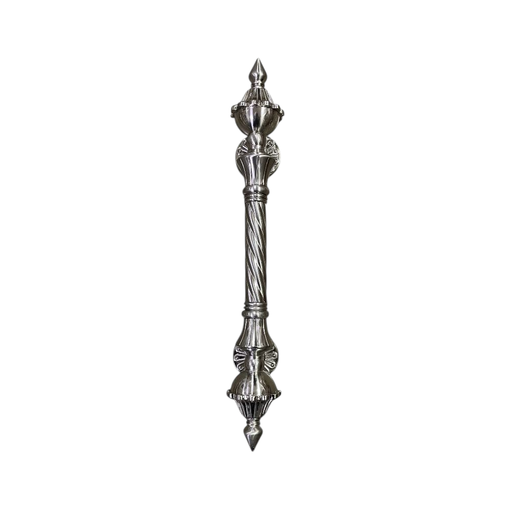 مقبض باب معدني أنيق مصمم للأبواب الخارجية، يتميز بتفصيل مجدول وطلاء سلفر لامع يمنح الباب مظهراً عصرياً ومتيناً مع أداء آمن للاستخدام اليومي.