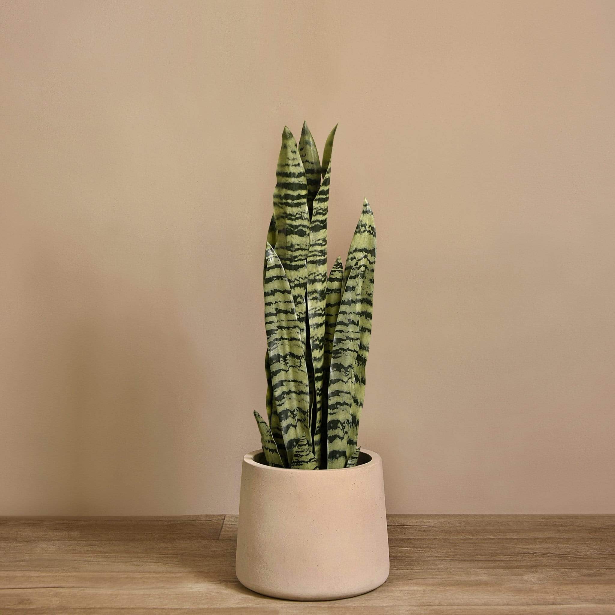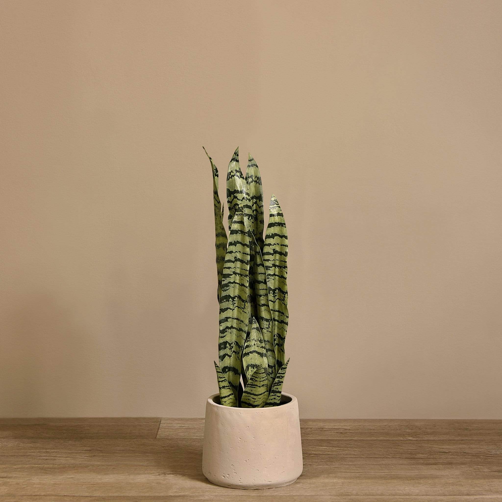 نبات سانسيفيريا صناعي بتفاصيل واقعية يضيف لمسة من اللون والملمس لأي مساحة داخلية. أوراقه الخضراء المخططة تمنحها مظهرًا نابضًا بالحياة، ويمكنك وضعه في أصيص محايد من اختيارك لإكمال الإطلالة.