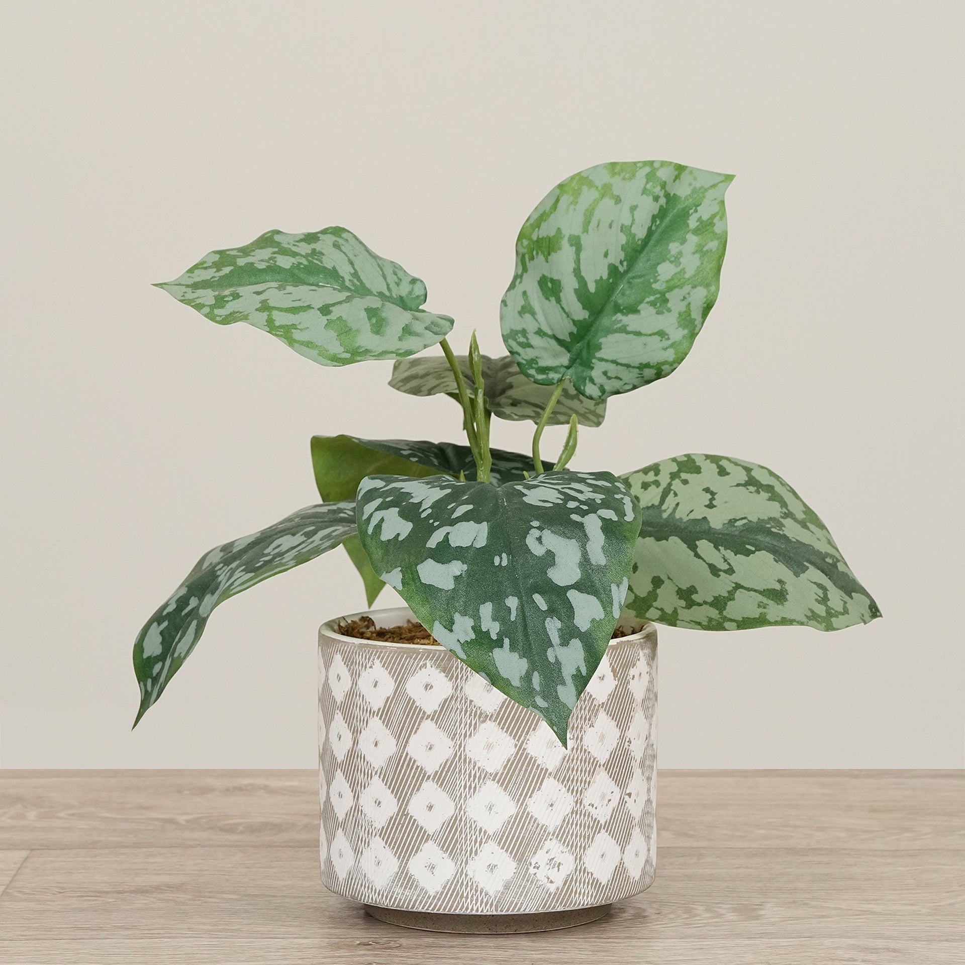 هذا التنسيق الأنيق لنبتة Scindapsus الصناعية موضوع في مزهرية خزفية يضيف لمسة خضراء راقية إلى ديكور منزلك أو مكتبك. الأوراق المصممة بشكل طبيعي بألوان أخضر وابيض ورمادي تخلق جواً هادئاً وأنيقاً دون الحاجة لأي عناية مستمرة.