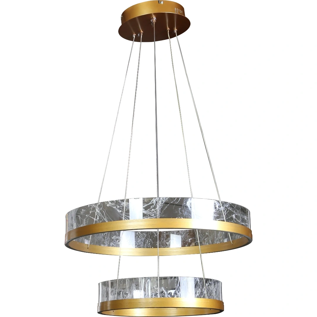 ثريا علاقي مودرن بلون ذهبيمصممة لتناسب البيوت الواسعة والطابع العصريإضاءة LED ثلاثية الألوان (تحويل بين 3 نغمات)مقاسات: 40 + 60 سمالقدرة الإجمالية: 135 واطتصميم مبهر ينعش المكان ويضفي طابع أنيق عصري