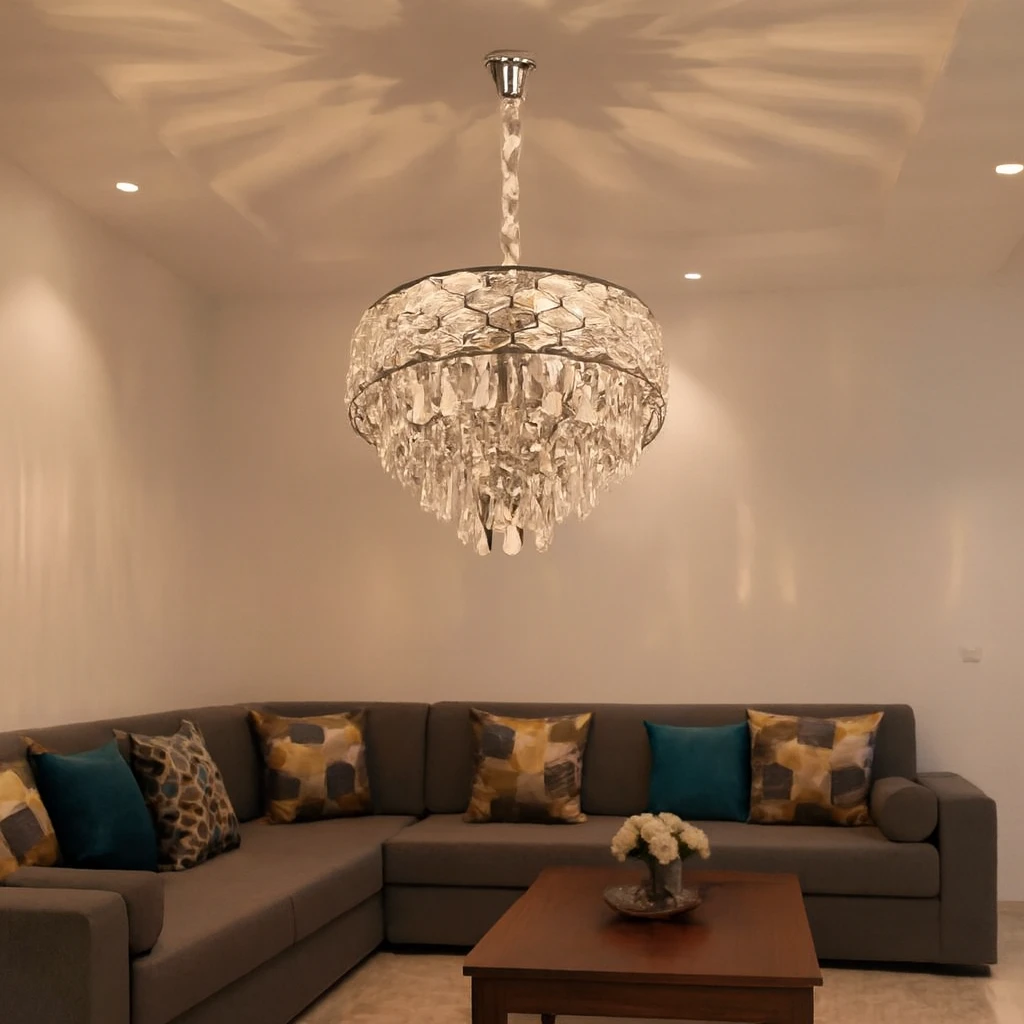 علاقي مودرن بتشطيب فضي وقطع كريستال عالية اللمعان، مصمم ليتناغم مع الديكورات المعاصرة والكلاسيكية على حد سواء. يعزز الإضاءة ويُضيف نقط تركيز فاخرة في غرفة المعيشة، غرفة الطعام أو بهو المنزل.
