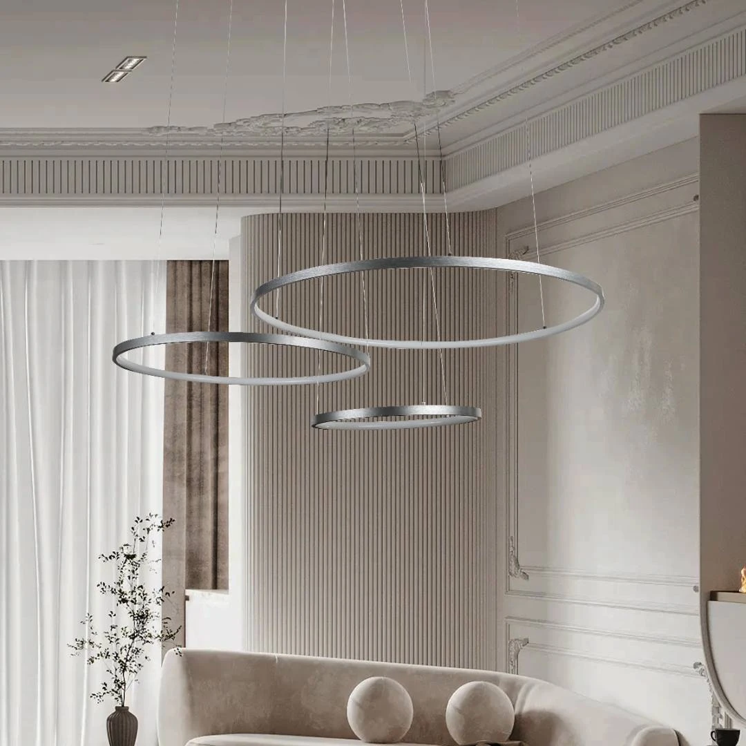 نجف مودرن بثلاث حلقات بلون فضي أنيق، مزوّد بمصابيح LED بقوة إجمالية 75 واط تنتج إضاءة صفراء دافئة تناسب الصالات، غرف الاجتماعات، والممرات. الجمع بين التصميم المعاصر والأداء العملي يجعل هذا المنتج خيارًا مثاليًا لتحسين الإضاءة والديكور مع استهلاك طاقة منخفض وعمر افتراضي طويل.