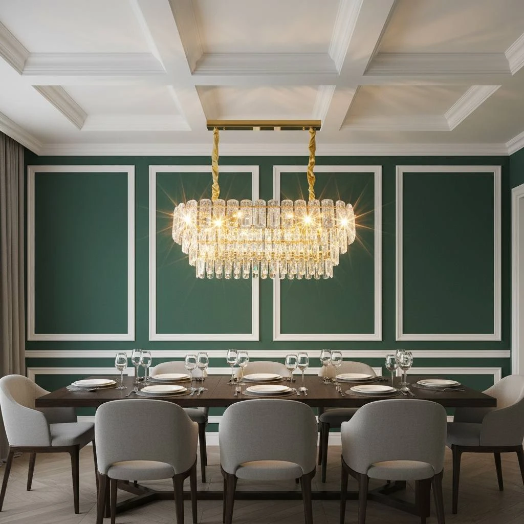 ثريا علاقي بتصميم معاصر تجمع بين الإطار الذهبي والتفاصيل الكريستالية اللامعة. تعزز الإضاءة والانعكاسات الكريستالية من الأجواء وتمنح الغرفة مظهراً أنيقاً ومركزياً مناسباً للصالات، غرف المعيشة، وقاعات الاستقبال.