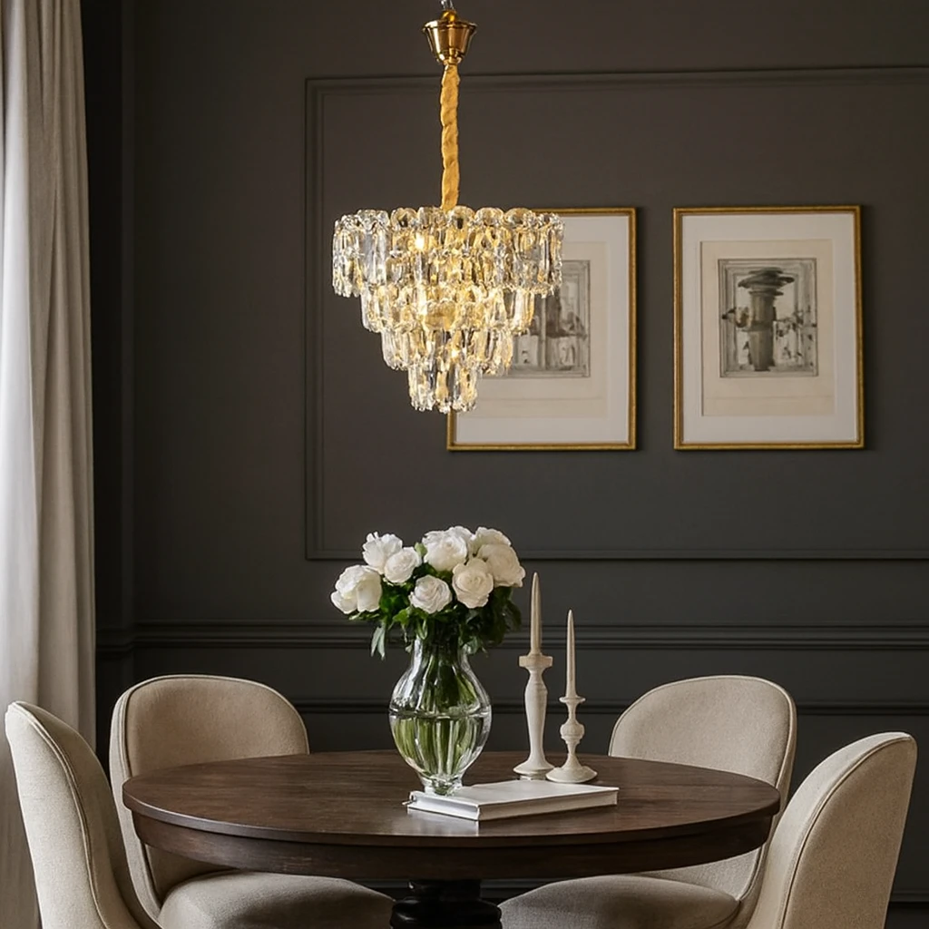 ثريا كريستال أوروبية تجمع بين العراقة والفخامة بتصميم مودرن أنيق. تبرز اللمسات الذهبية والكريستال اللامع لتمنح المساحة طابعًا راقٍ ودافئًا، مما يجعلها خيارًا مثاليًا لغرف المعيشة، الصالونات، وغرف الطعام.