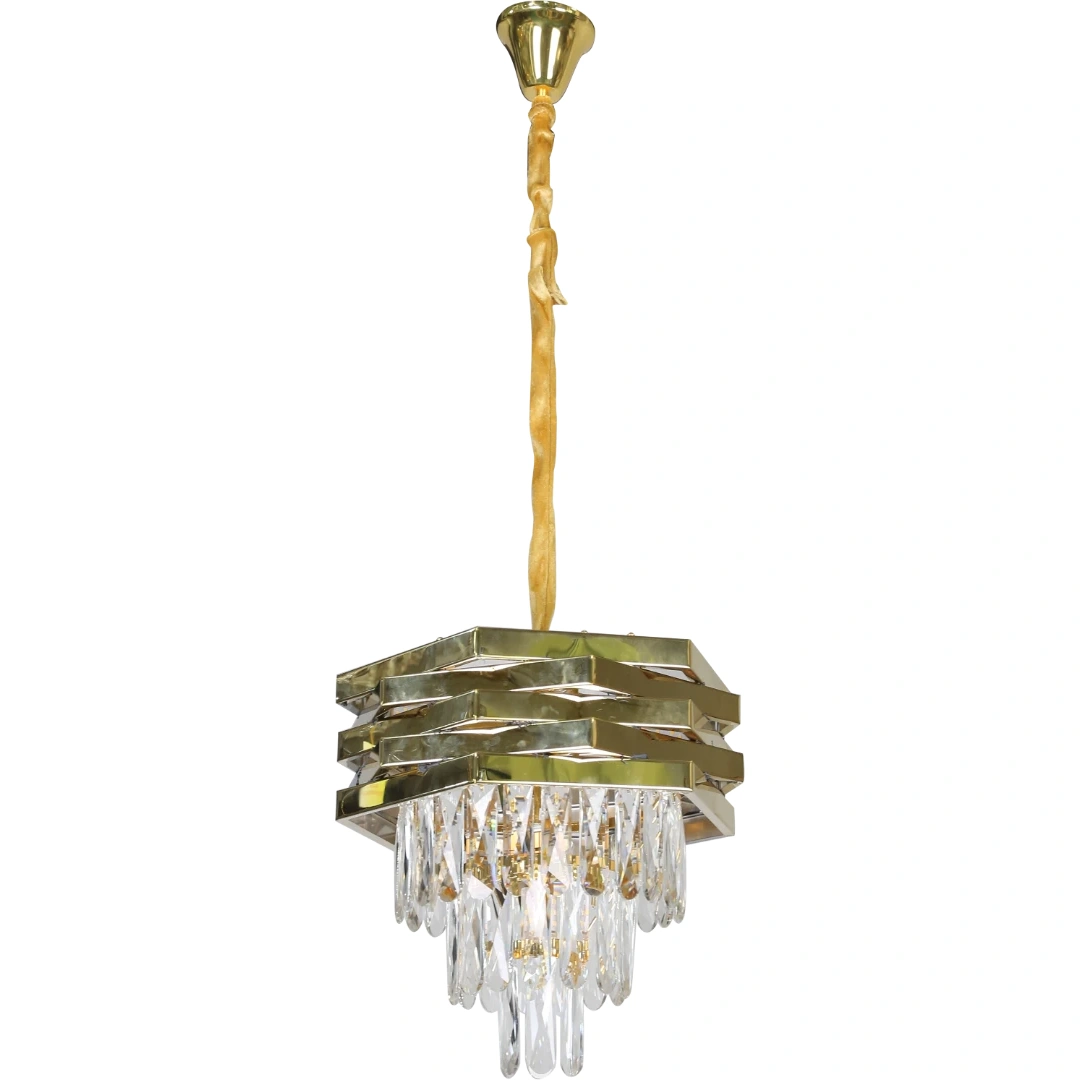 نجف علاقي ذهبي بتشطيب كريستال أنيق مزود بثلاث قواعد لمبة E14 (E14*3) كريستالات ناعمة بتصميم أوروبي عصري يولّد بريقًا متغيّرًا مع حركة الضوء لزيادة الحيوية واللمعان مثالي للصالات، غرف المعيشة والمداخل كعنصر زخرفي يضفي لمسة فخامة وأناقة على الديكور الداخلي