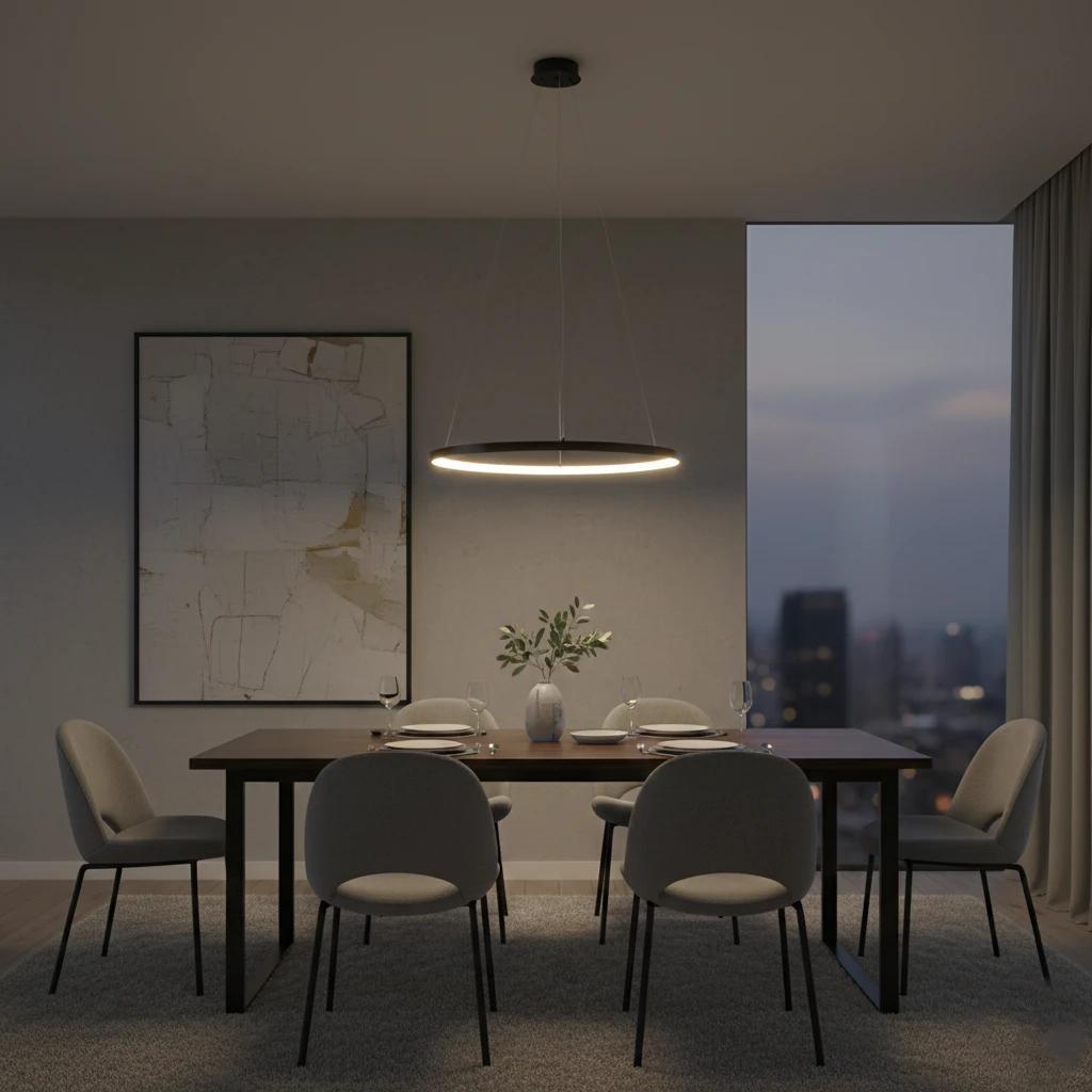 نجف معلق بتصميم مودرن أنيق باللون الأسود يمنح المكان إضاءة دافئة بلون أصفر، مثالي للصالات، غرف المعيشة، والمناسبات التي تحتاج إلى طابع جمالي مع إضاءة مريحة.