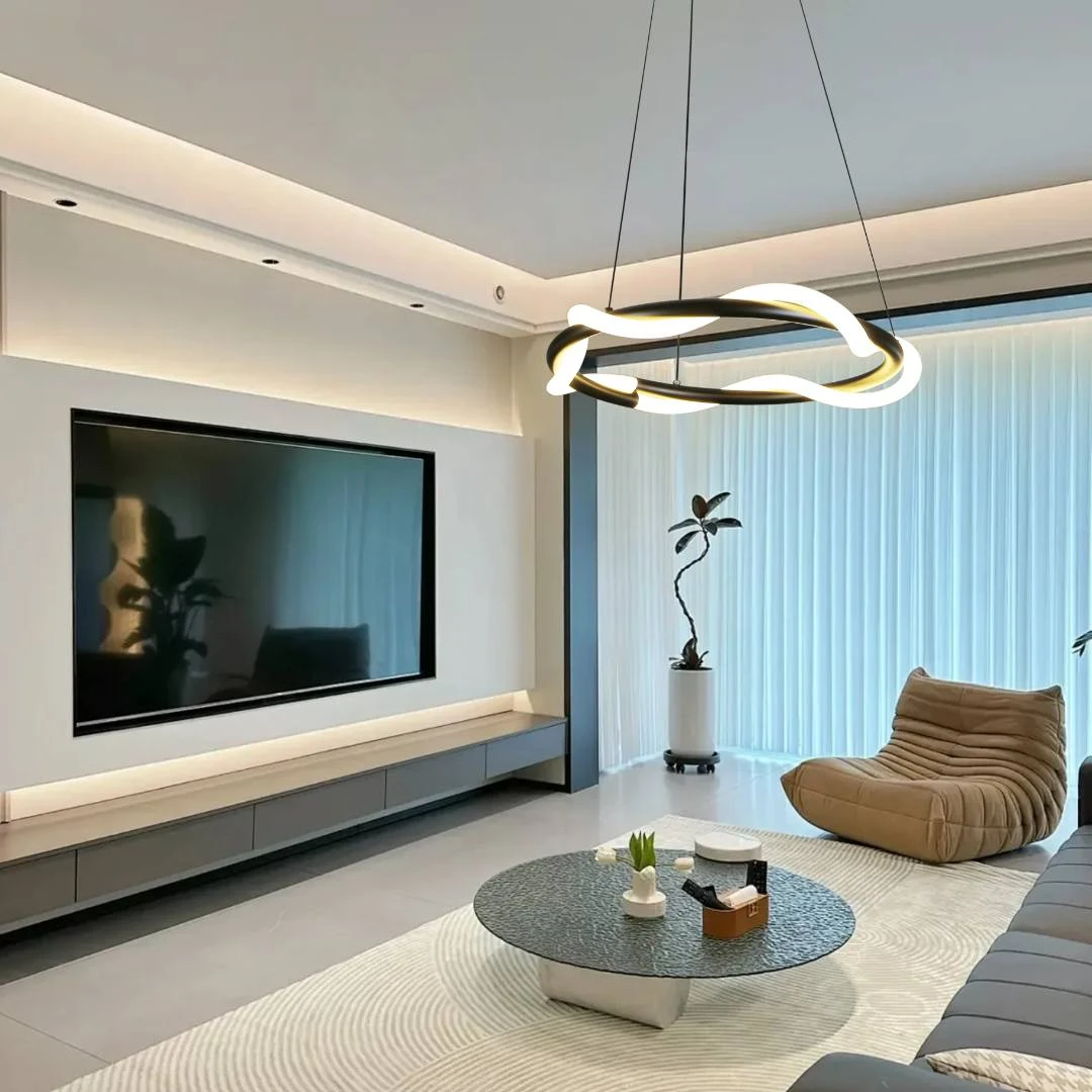 نجف مودرن أنيق ومناسب للأماكن المفتوحة والأسقف العالية. تصميم عصري يضيف لمسة جمالية ودافئة لأي غرفة بفضل إضاءة بلون أصفر مريح للعين، مع إمكانية تركيب وتعديل سهل ليناسب مساحات متعددة.