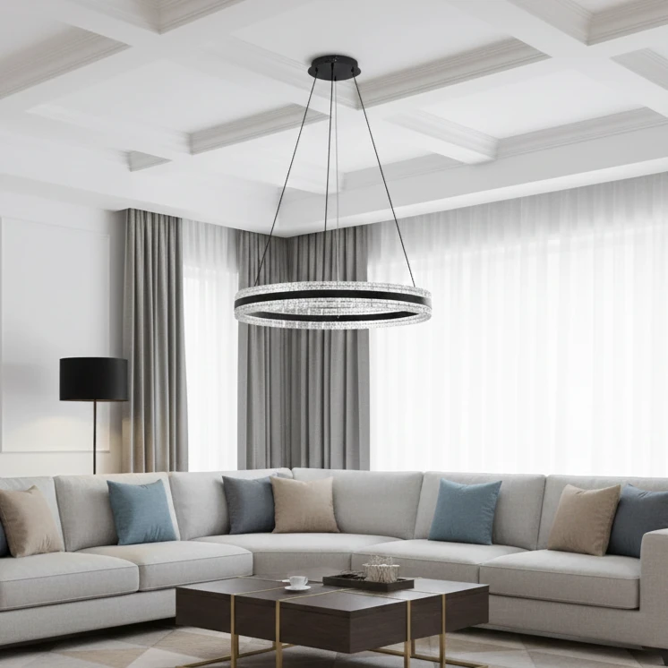 ثريا مودرن أنيقة بلون أسود تمنح المكان إضاءة هادئة ومريحة للعين، وتضفي طابعاً عصرياً وراقياً على الصالون أو غرفة المعيشة أو المكتب.