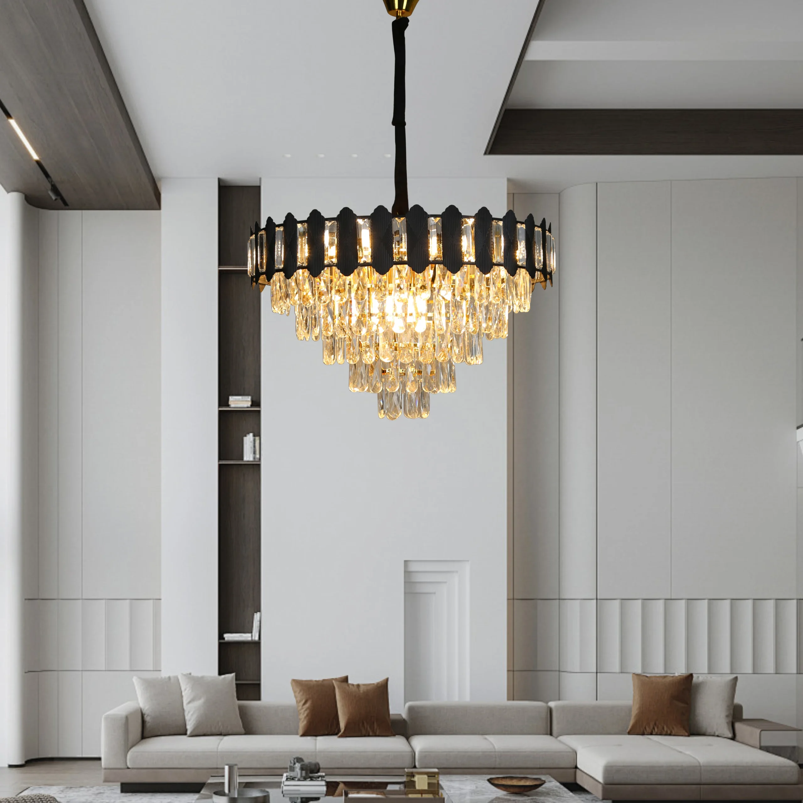بريق الكريستال يمنح التصميم لمسة من الفخامة والأناقة الحديثة؛ مناسب لإضاءة غرفة المعيشة أو غرفة الطعام أو أي مساحة تريد لها مظهرًا راقيًا ومضيئًا.