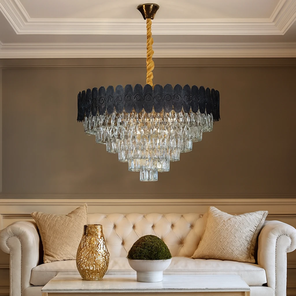 تصميم يجمع بين الفخامة العصرية والأناقة الكلاسيكية بلمسات كريستالية أوروبية. هذا النجف الأسود مع تفاصيل ذهبية يضيف نقطة محورية راقية لأي مساحة داخلية، مع توزيع ضوئي متوازن يناسب الصالون، غرفة الطعام أو المدخل الفاخر.