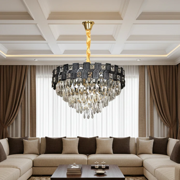 نجف بتشطيب أسود مودرن مع كريستالات أوروبية مصقولة ترفع مستوى الإضاءة وتعكسها لتُبرز تفاصيل الغرفة. تصميمه المتوازن يمنح لمسة فاخرة دون إسراف، مناسب للمنازل العصرية والأنيقة.
