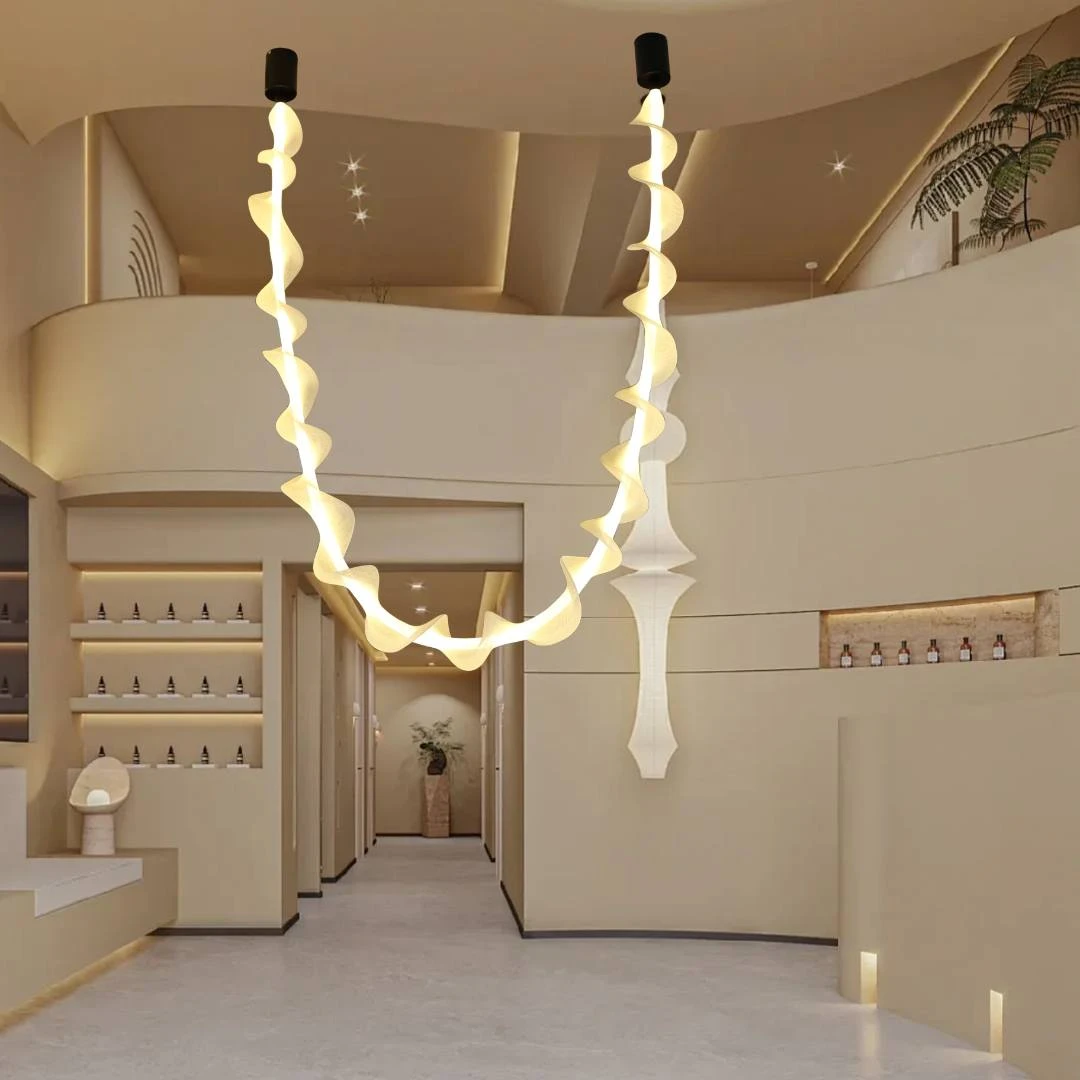 نجف مودرن أنيق يجمع بين تصميم معاصر وإضاءة LED دافئة بلون أصفر، مثالي لإضفاء جو مريح وراقي على غرفة المعيشة أو غرفة النوم أو الصالون.