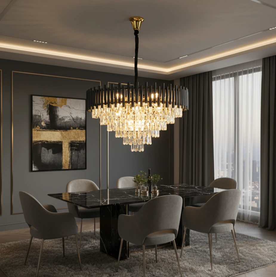 إضاءة كريستالية بطراز أوروبي تجمع بين الفخامة والحداثة. هذه الثريا المصممة بغطاء أسود وتفاصيل ذهبية تضيف لمسة أنيقة ودائمة إلى أي مساحة داخلية، مناسبة لغرفة المعيشة، السفرة أو الردهات الراقية.