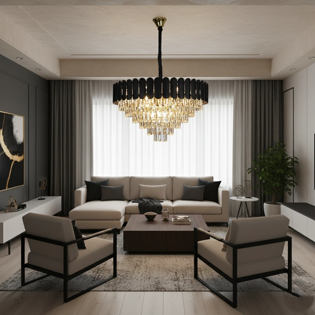 ثريا مودرن بتصميم أوروبّي فخم تجمع بين الغطاء الأسود ولمسات ذهبية مع عناصر كريستال لخلق إضاءة جمالية راقية تضفي طابعاً أنيقاً وعصرياً على الفراغ.