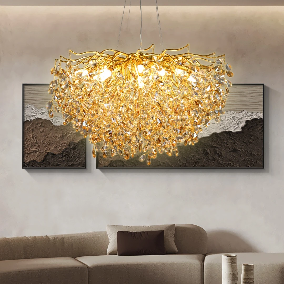 نجف مودرن بقطر 80 سم بلون ذهبي وعسلي مع قطع شفافة — 13 لمبة E14