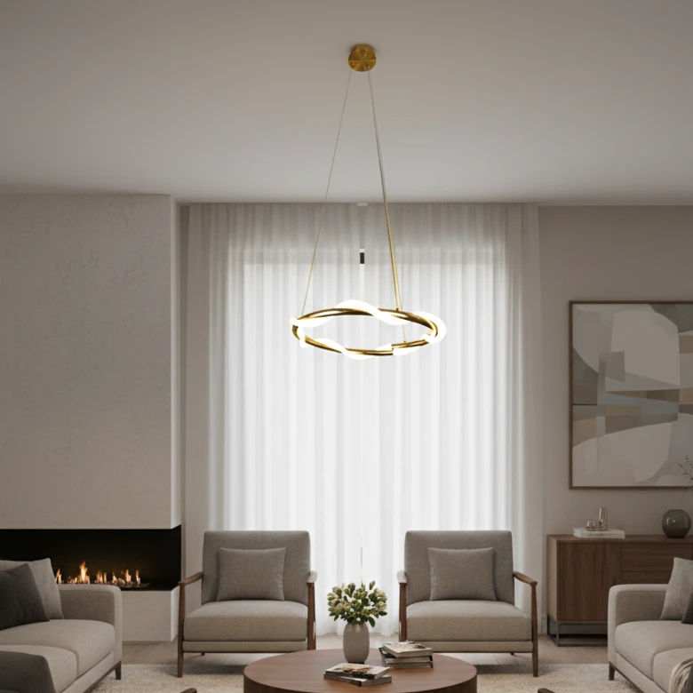 نجف مودرن بتصميم معاصر بلون هيكل زيتي مع إنارة LED بلون أصفر دافئ. يجمع بين مظهر أنيق وإضاءة مريحة مناسبة للأماكن الداخلية مثل غرف المعيشة وغرف الطعام.