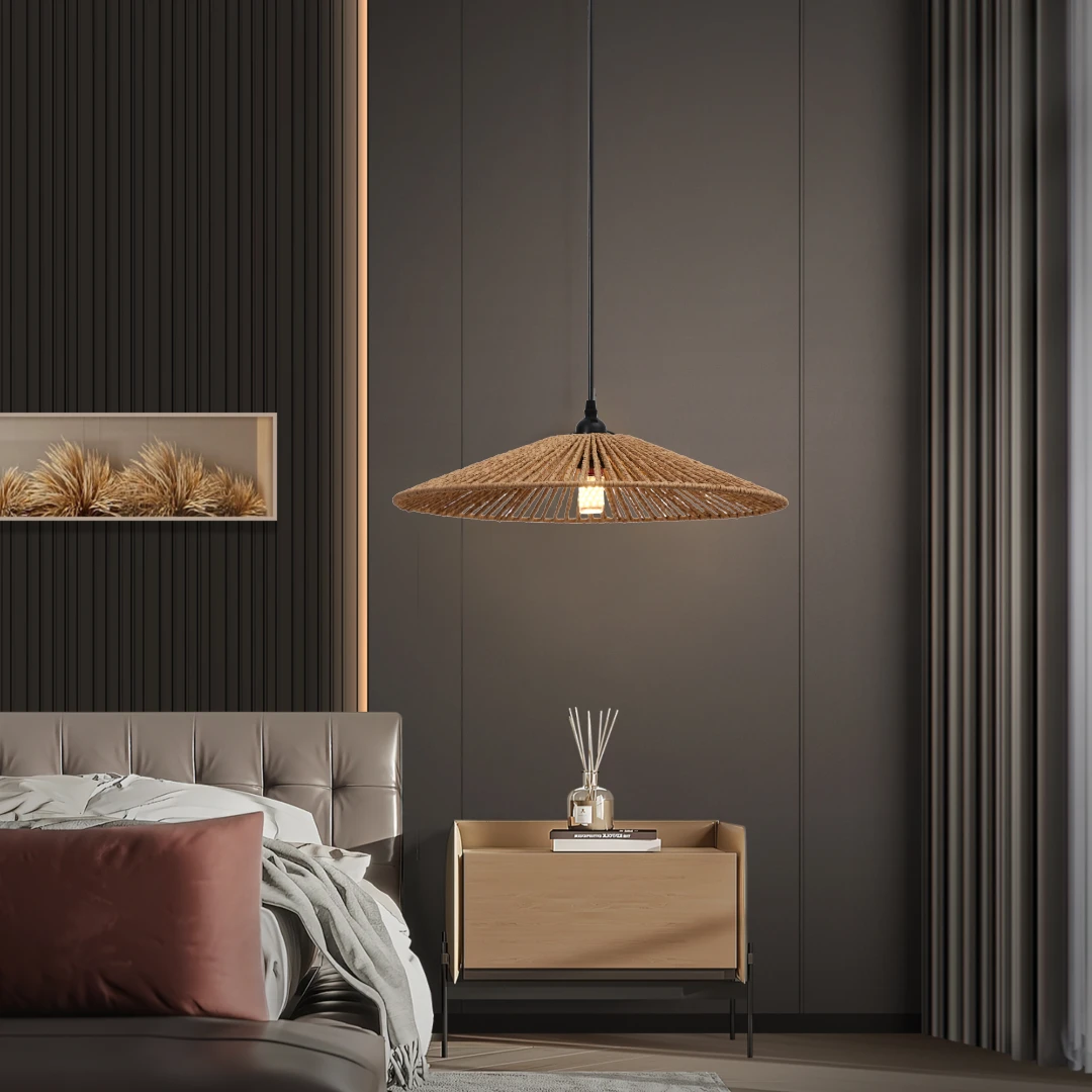 نجف يجمع بين الطابع الريفي واللمسة العصرية، مصمم من حبال طبيعية بلون بني يمنح المساحة دفء وملمساً مميزاً مع تصميم مبتكر يذكر بحبال الأدغال بأسلوب معاصر.