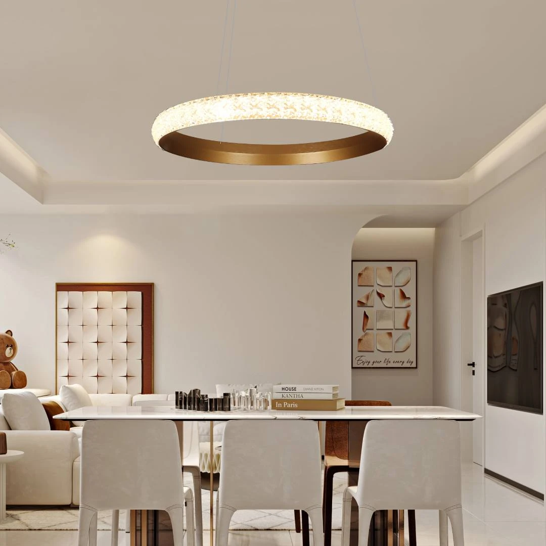 نجف راقٍ بتصميم مودرن يضفي لمسة فاخرة على أي زاوية في المنزل العصري. إطار ذهبي أنيق مع إضاءة دافئة تجعل الغرف مريحة ومبهجة.