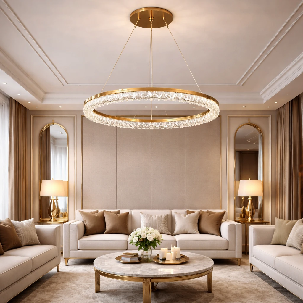 ثريا عصرية بتصميم أنيق ولون ذهبي فاخر تضفي لمسة فخامة على أي مكان مع إنارة قوية ومريحة في نفس الوقت. مناسبة للصالات، غرف الطعام، أو الاستقبال حيث توازن بين الجمال والأداء.
