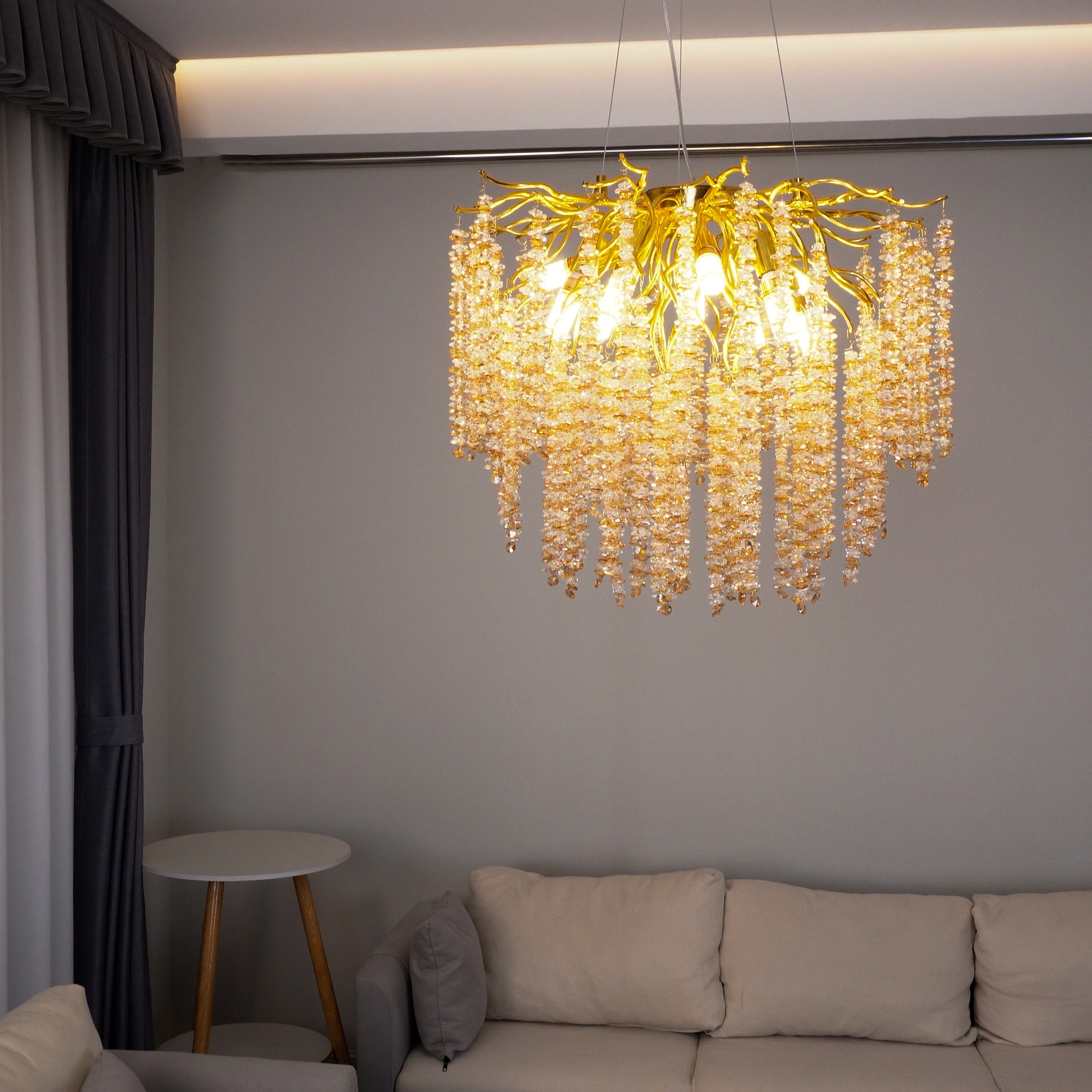 إضاءة فاخرة بتصميم معاصر تضيف لمسة أناقة ورقي إلى ديكور منزلك. نجفة ذهبية بتفاصيل شفافة وعسلية، مناسبة لغرف المعيشة، غرفة الطعام أو المدخل، مع إمكانية ضبط شدة الإضاءة بحسب حاجتك.